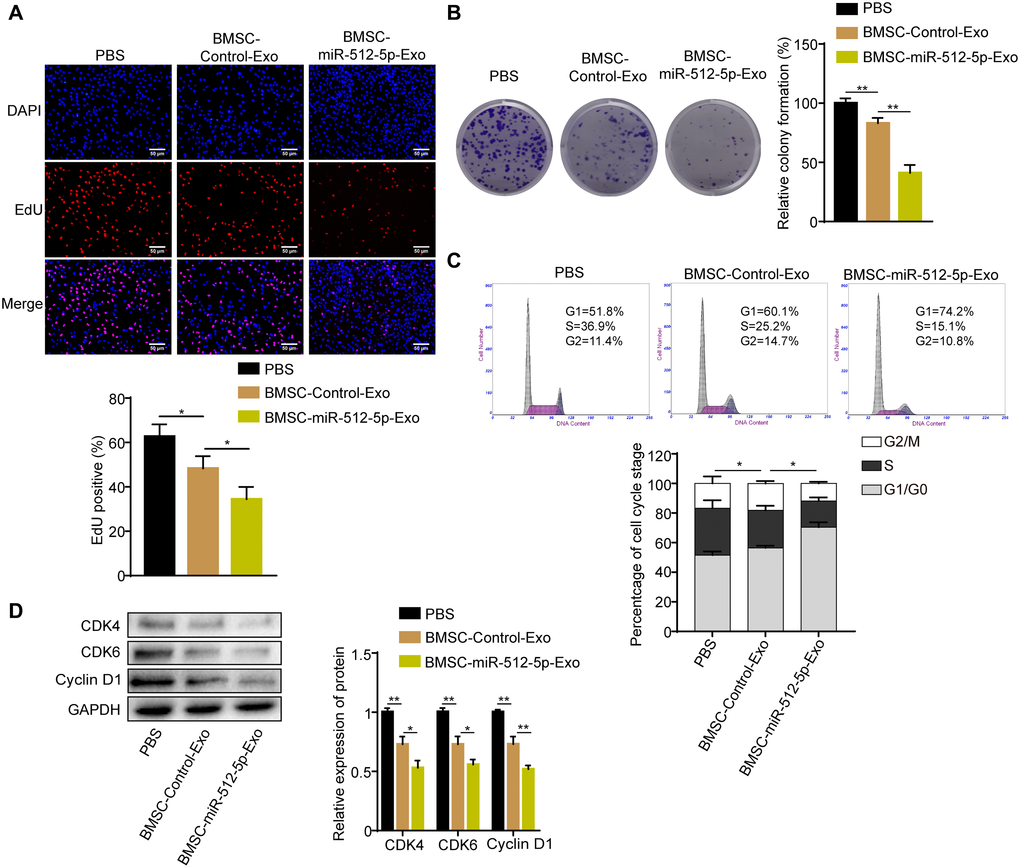 To further explore whether the exosomes derived from BMSC carrying miR-512-5p affects GBM cell function, U87 cells were co-cultured with BMSC-derived exosomes or PBS. U87 cells co-cultured with BMSC-derived exosomes (BMSC-miR-512-5p-Exo or BMSC-Control-Exo) had inhibited proliferation and G1-S phase cell cycle compared to the PBS group based on EdU, colony formation, and flow cytometry assays (Figure 6). In addition, treatment with BMSC-miR-512-5p-Exo reduced cell proliferation and induced cell cycle arrest to a greater extent than the BMSC-Control-Exo group. These data suggest that BMSCs can deliver miR-512-5p via exosomes to regulate GBM cell proliferation and cell cycle.