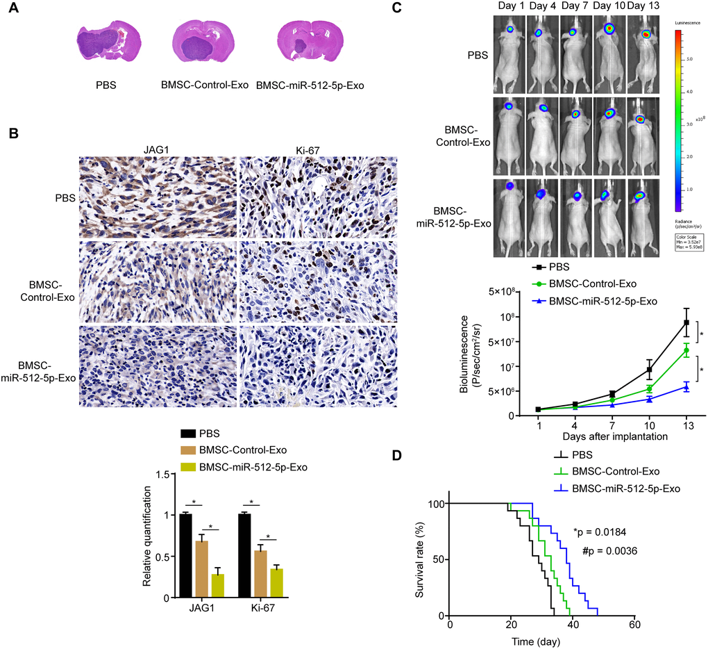 Next, we injected BMSC-miR-512-5p-Exo, BMSC-Control-Exo, and PBS into nude mice through the tail vein. The whole-brain section H&E staining showed that the xenograft tumors of the BMSC-derived exosomes group were smaller than that of the PBS group. The xenograft tumors of the BMSC-miR-512-5p-Exo group was significantly smaller than the BMSC-Control-Exo group (Figure 7A). Furthermore, JAG1 and Ki-67 expression was lower in the BMSC-derived exosomes group relative to the PBS group by immunohistochemistry analysis, with expression for the BMSC-miR-512-5p-Exo group being significantly lower than the BMSC-Control-Exo group (Figure 7B). Moreover, bioluminescence imaging of the U87 GBM intracranial model showed that it grew more slowly in the BMSC-derived exosomes group compared to the PBS group, and the tumor growth of BMSC-miR-512-5p-Exo group was significantly slower than the BMSC-Control-Exo group (Figure 7C). The survival time of nude mice showed that the BMSC-miR-512-5p-Exo group significantly prolonged survival compared to the BMSC-Control-Exo and PBS groups (Figure 7D). In conclusion, these results suggest that the BMSC-exosomal miR-512-5p inhibits GBM growth in vivo.