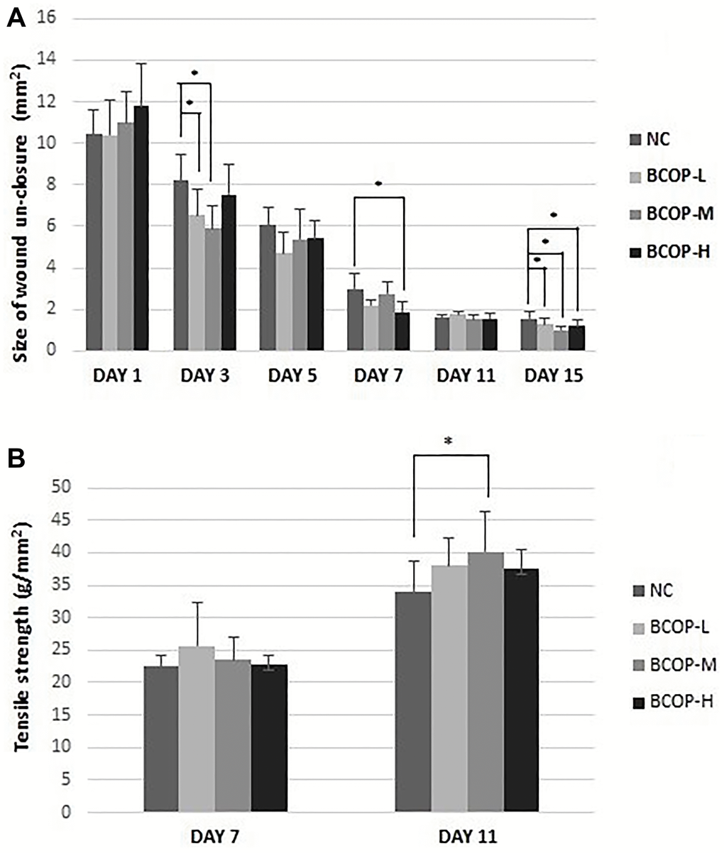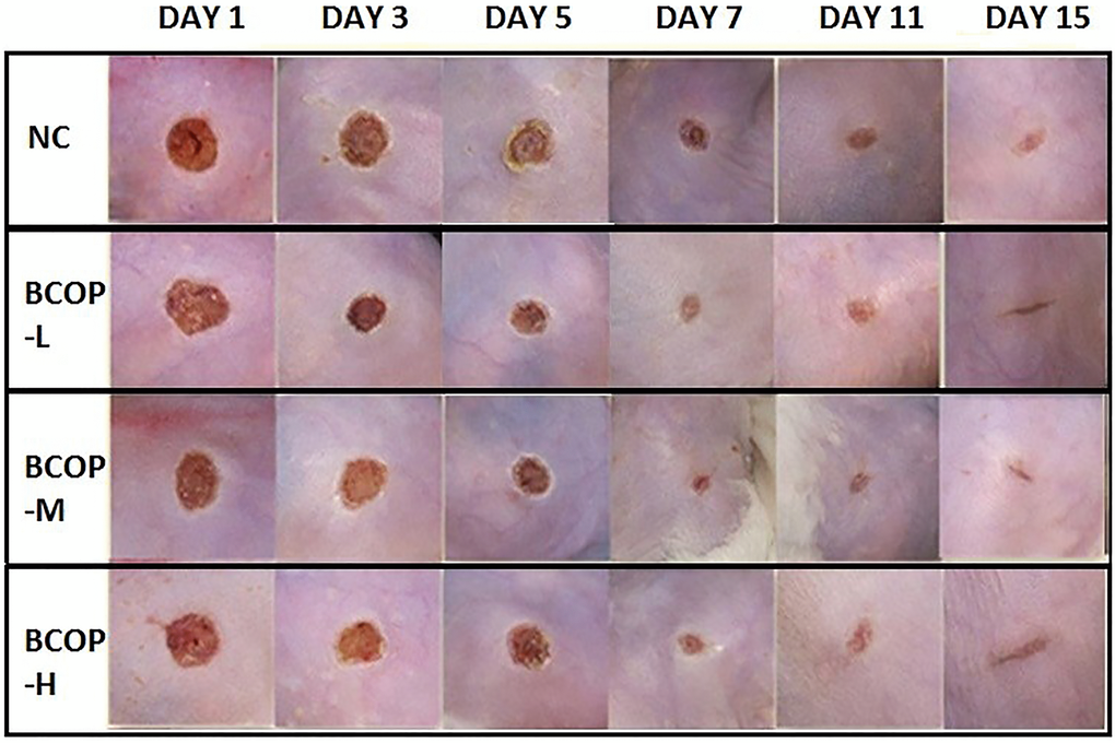 Therefore, in this study, we used two wound models to investigate whether BCOP can improve wound healing in mice and its possible mechanisms. To this end, we intragastrically administered deionized water as vehicle, and BCOP to mice and evaluated the effects of BCOP on wound healing compared with vehicle.