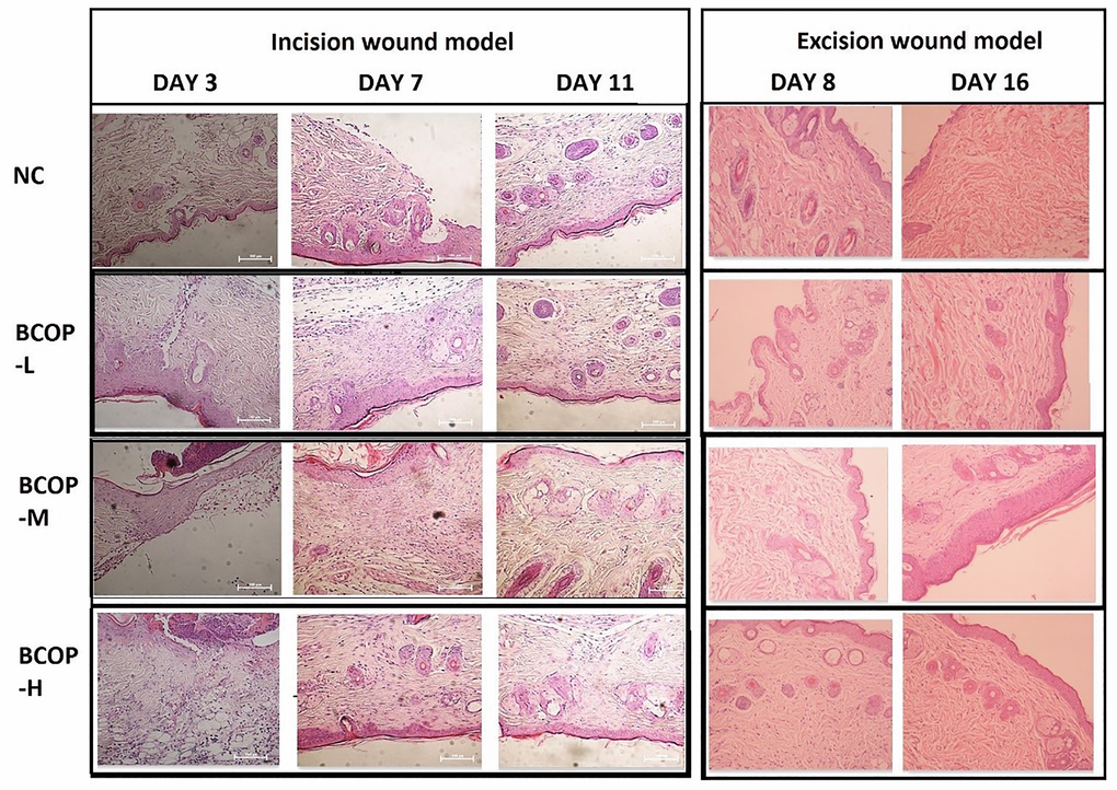 Histological assessment, including the extent of neutrophil and fibroblast infiltration, collagen deposition, angiogenesis and epithelialization in the wound area, was shown in Figure 3. Compared to NC, mice in the BCOP-treated groups showed enhanced fibroblast infiltration, increased blood vessel formation, collagen deposition, and epithelialization. In groups treated with BCOP, the number of infiltrating fibroblasts in the subcutaneous tissue increased significantly on day 7 (full-thickness incision model) and day 8 (full-thickness excision model). In addition, on day 11 (full-thickness incision model) and day 16 (full-thickness excision model), a large amount of collagen deposition was observed in BCOP-treated groups. Moreover, on day 11 (full-thickness incision model) and day 16 (full-thickness incision model), the epithelialization of BCOP-treated groups was significantly larger than that of the NC.