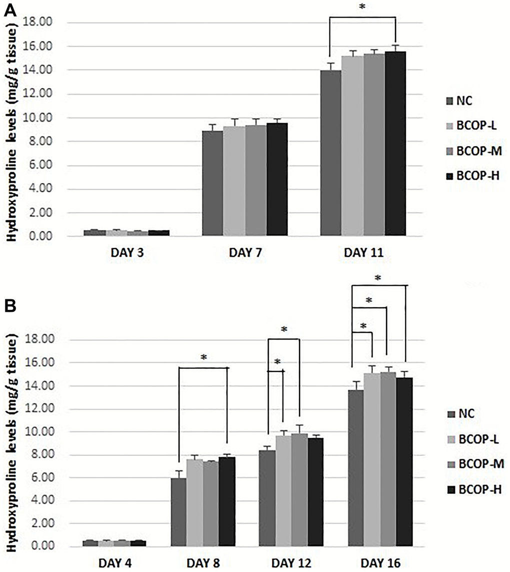 Collagen deposition plays a key role in granulation tissue formation, and Hyp levels indicate collagen content. To confirm these histological observations, Hyp levels were measured in the lesion on day 3, 7 and 11 in full-thickness incision model and on day 4, 8, 12 and 16 in full-thickness excision model. The results showed, in the skin, compared with NC, the Hyp concentration increased significantly in the BCOP groups (on day 11 in full-thickness incision model and on day 8, 12 and 16 in full-thickness excision model) (p < 0.05) (shown in Figure 4).