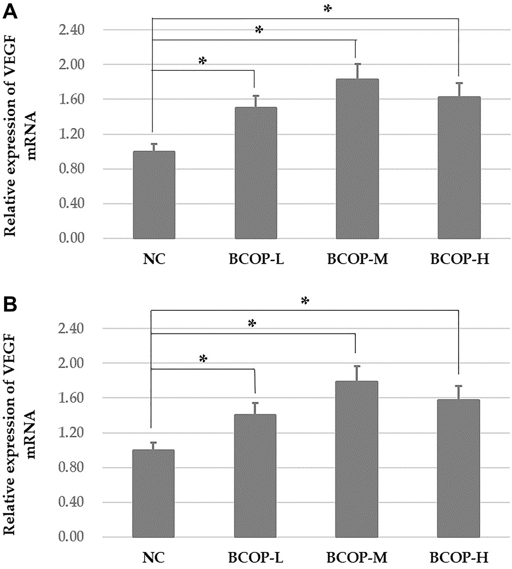 As shown in Figure 5, on day 11 in full-thickness incision wound model and day 16 in full-thickness excision wound model, the mRNA expression of VEGF was both markedly increased in BCOP groups compared with NC (p < 0.05).