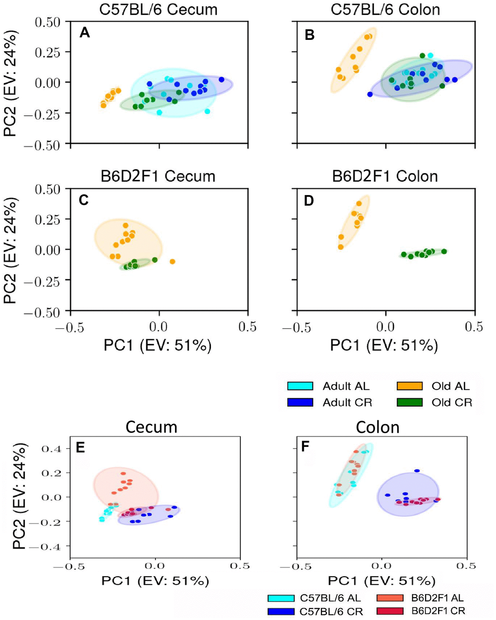 Using male mice obtained from the aging colony maintained by the NIA, we studied the microbiota composition of the cecum and colon of 9- and 24-month old male C57BL/6JN mice fed AL or CR (started at 14 weeks of age) by sequencing the V4 region of the bacterial 16S rRNA gene. These data are presented in Supplementary Tables 1, 2. Because genotype of the host can impact the microbiome, we also analyzed the microbiome of male B6D2F1 mice obtained from the NIA. Adult B6D2F1 were not available from the NIA; therefore, we were only able to measure the microbiome of the cecum and colon of 24-month-old B6D2F1 mice fed either AL or CR (Supplementary Table 3). The data in Supplementary Tables 1–3 were analyzed by principal component analysis (PCA), and the results are shown in Figure 1. For C57BL/6JN mice (Figure 1A, 1B), adult mice fed AL or CR and the old mice fed CR grouped together for both the cecum and colon. Importantly, old AL mice were clearly segregated from the other three groups for both the cecum and colon, indicating that CR attenuated the effect of age on the microbiome in the old mice. In old B6D2F1 mice (Figure 1C, 1D), we observed a clear separation in the colon microbiome for mice fed AL and CR; however, the microbiome of the cecum of the AL and CR groups overlapped primarily because of one animal (Figure 1C). Figure 1 also shows that when projecting all of the data in the same space, the old mice fed AL consistently occurred on the left side of the plots, indicating that age and CR have similar metagenomic effects in the two strains of mice in both the cecum and colon. In Figure 1E, 1F, we directly compared the microbiome data for the cecum or colon in old C57BL/6JN and B6D2F1 mice. In the cecum, there was very little separation between the four groups. In contrast, we observed a clear separation between AL and CR mice in the colon, suggesting that the effect of CR on the microbiome becomes modified as the fecal material transits to the colon. Interestingly, the C57BL/6JN and B6D2F1 mice grouped together for both AL and CR, indicating that diet was a more important variable than strain with respect to the effect of age and CR on the microbiome.