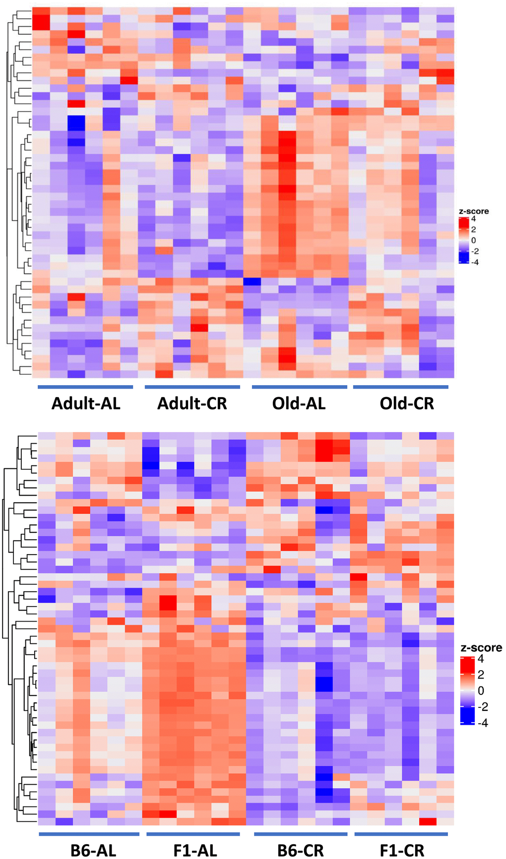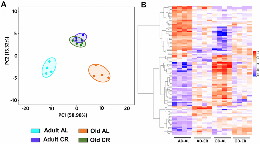Figure 10A shows PCA analysis of differentially expressed genes [P (Corr) < 0.05 and 2.0-fold] in old CR, old AL, adult CR based on adult AL in the C57BL/6JN mice. The transcriptomes of the adult and old CR mice formed clusters that were clearly separated from each other. In contrast to what we observed for the microbiome and metabolome, both adult CR and old CR formed clusters that were clearly separate from their AL counterparts. Interestingly, adult and old CR mice formed clusters that overlapped, suggesting a similarity in the transcriptome of adult and old CR mice. Figure 10B shows the heatmap of genes that changed significantly in the C57BL/6JN mice. CR resulted in a major shift in the transcriptome pattern in both adult and old mice. These data agree with the PCA data in Figure 10A, which showed that CR altered the transcriptome in both adult mice and old mice.