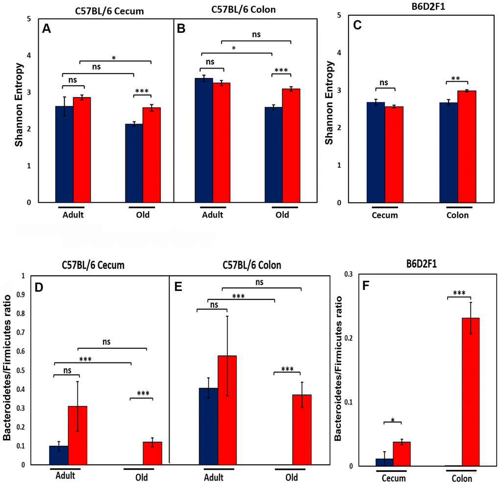 We also measured the ratio of Bacteroidetes to Firmicutes in the cecum and colon of the C57BL/6JN and B6D2F1 mice because this ratio has been correlated with various diseases and has been reported to change with age [17–20]. Figure 2D, 2E show that the ratio of Bacteroidetes to Firmicutes decreases in both the cecum and colon with age in C57BL/6JN mice, and this decrease is attenuated by CR in old mice resulting in a ratio similar to adult mice fed AL. Although CR increased the ratio of Bacteroidetes to Firmicutes in adult mice, this increase was not statistically significant. In the B6D2F1 mice (Figure 2F), the ratio of Bacteroidetes to Firmicutes was significantly higher in CR mice compared to mice fed AL especially in the colon.