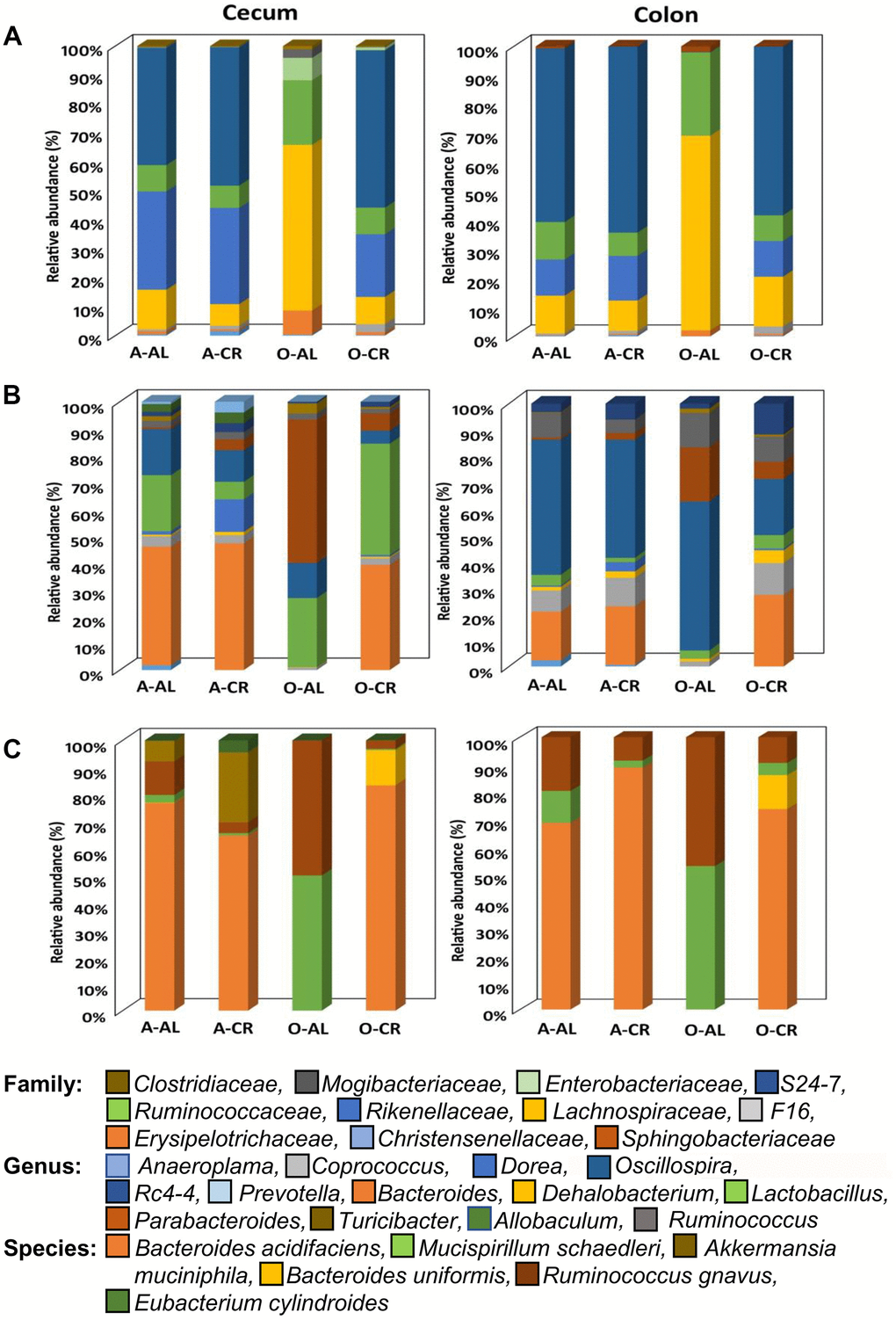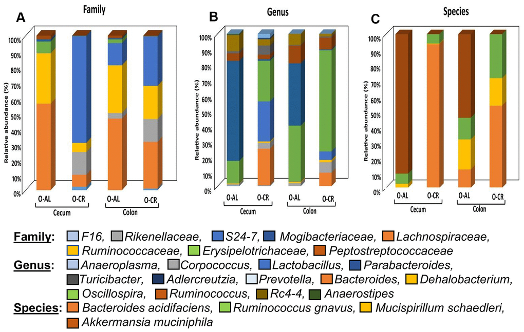Figure 4 shows the relative abundance of the microbes that changed with age or diet for old B6D2F1 mice. At the family level, the cecum and colon from old AL mice showed similar profiles with a greater abundance of Lachnospiraceae and Ruminococcaceae as was found in C57BL/6JN mice. The cecum of old CR B6D2F1 mice showed a greater abundance of S24-7 and Rickenellaceae families (which was similar to C57BL/6JN mice) whereas the colon of old CR B6D2F1 mice showed an abundance in the S24-7, Lachnospiraceae, Ruminococcaceae and Rickenellaceae families. At the genus level, the cecum and colon of the old AL B6D2F1 mice showed an increase in the abundance of the Parabacteroides, Oscillospira, Ruminococcus and Rc4-4 families. The cecum of old CR mice showed a greater abundance in Lactobacillus, Oscillospira and Bacteroides families whereas the colon of old CR mice had an increased abundance of Oscillospira (>50%). In the Cecum and colon of old B6D2F1 mice fed AL, Akkermansia municiphila was the prominent species found. In contrast, Bacteroides acidifaciens and Ruminococcus gnavus were the predominant species in the cecum and colon of old CR mice.