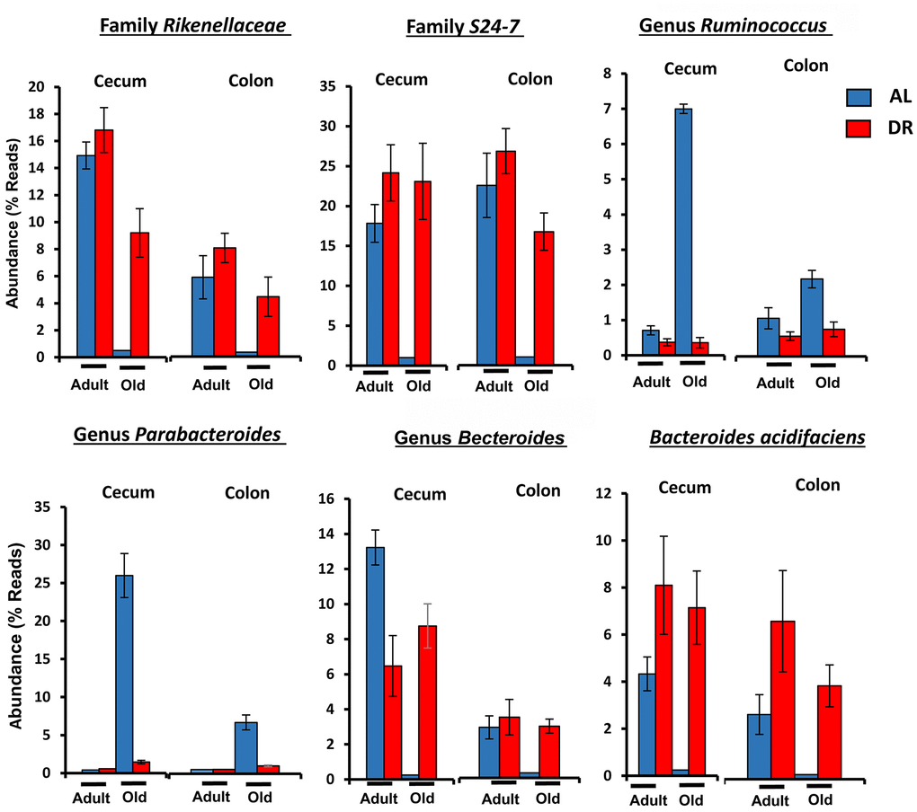 Figure 5 shows the effect of age and CR in C57BL/6JN mice on the abundance of the six microbes from Table 1 that were the most abundant; collectively, these microbes comprised between 5 to 50% of the microbiome. The abundance of all six microbes showed similar changes with CR in the cecum and colon. Four of microbes showed a major decrease in abundance with age (Bacteroides acidifaciens, Bacteroides, Rikenellaceae, and S24-7), which was completely reversed by CR. Two of the most abundant microbes that showed the most dramatic changes were the genus Parabacteroides and the S24-7 family. Parabacteroides increased 100-fold in the cecum from less than 1% to over 25% of the microbiota in the old AL mice. In the colon, Parabacteroides abundance increased over 30-fold in the colon making up almost 5% of the microbiota in the old AL mice. CR reduced the abundance of Parabacteroides to less than 2% in both the cecum and colon of old mice. The S24-7 family of microbes decreased from 17 to 27% in the cecum and colon, respectively, of adult mice to negligible levels (less than 0.2%) in the old AL mice. CR resulted in an increase in the abundance of the S24-7 family to over 19% in the cecum and colon.