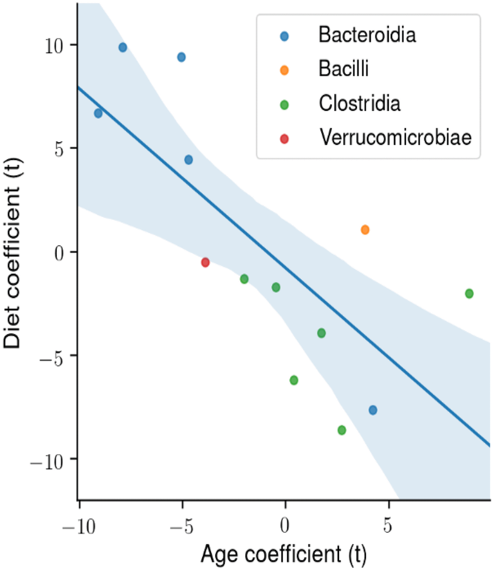We next determined the degree of association in the abundance of the four microbial classes that made up the majority of microbes that changed with age and diet. Figure 6 shows the t-statistic from the OLS model when each coefficient is plotted for each microbial class. A positive t-statistic for diet indicates that microbial abundance in that class increases with CR, and a positive t-statistic for age indicates that microbial abundance increases with age. The data in Figure 6 show a negative correlation for the phylogenetic class with CR and age, indicating that CR has opposing effects on the gut microbiome compared to age. In addition, the phylogenetic class Bacteroidia is associated with CR and youth, whereas the class Clostridia is associated with AL and age.