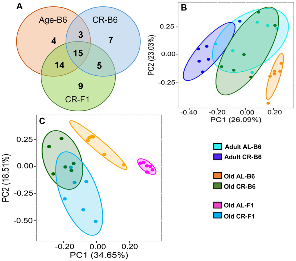 To understand how age and CR might affect the microbiome, we also measured the metabolites in the fecal pellets from the colon of the C57BL/6JN and B6D2F1 mice by targeted liquid chromatography mass spectrometry as described in the Methods. Supplementary Table 5 lists the 98 metabolites detected in the fecal samples and the levels of these metabolites in the fecal pellets obtained from the two strains of mice. We observed that the levels of 57 of the 98 metabolites exhibited a significant change with either age (old AL vs adult AL in C57BL/6JN) or CR in the C57BL/6JN (old AL vs old CR) and B6D2F1 (old AL vs old CR) mice as shown in the Venn diagram in Figure 7A. The levels of 36 metabolites changed with age in AL C57BL/6JN mice, 30 changed with CR in the old C57BL/6JN mice, and 43 changed with CR in the old B5D2F1 mice. Approximately 60% of the metabolites that changed with age were significantly attenuated by CR in the C57BL/6JN mice and two-thirds of the metabolites that changed with CR were the same for the old C57BL/6JN and B6D2F1 mice. The data in Supplementary Table 5 were analyzed by principal component analysis, and the results are shown in Figure 7B, 7C. For the C57BL/6JN mice, the adult AL and CR mice and the old CR mice overlapped; however, the old mice fed AL formed a separate cluster (Figure 7B). Figure 7C shows the PCA for old mice fed either AL or CR. While there was some overlap between old C57BL/6JN and B6D2F1 mice fed AL, the old CR C57BL/6JN or B6D2F1 mice were clearly separated from the old mice fed AL, with the B6D2F1 mice showing the greatest separation.