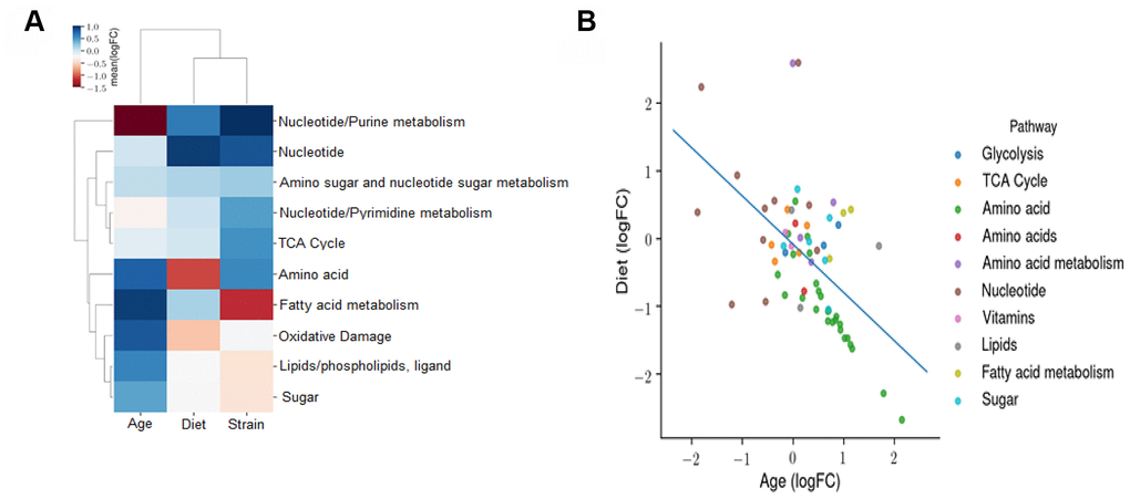 We next determined the effects of age, diet, and strain on the metabolomic profile using an OLS linear model. The coefficients of this model reflect the independent fold changes on metabolic pathways represented by the metabolites that changed with age, diet, and strain. The heatmap in Figure 9A shows the average log2FC attributable to age, diet, and strain among all the metabolites measured in the respective pathways. The data show the following: the metabolomic effects of age and CR are broadly anti-correlated and the metabolomic profile of the B6D2F1 mice is correlated with that of CR and anti-correlated with that of age, suggesting that the B6D2F1 mice have bacteria that produce metabolites that are more reflective of the bacteria in younger animals and CR mice compared to the C57BL/6JN mice. To contrast the effects of age and CR on the metabolomic profile, we again used an OLS linear model where the coefficients reflect the independent fold changes in metabolome abundance resulting from age and diet. Figure 9B shows the average log2FC attributable to age and diet among all the metabolites measured in their respective pathways. The data show that the effects of age and CR on the metabolome are broadly anti-correlated as one would predict. In addition, pathways related to amino acid metabolism broadly increase with age and decrease with CR, whereas pathways associated with nucleotide metabolism increase with CR and decrease with age.