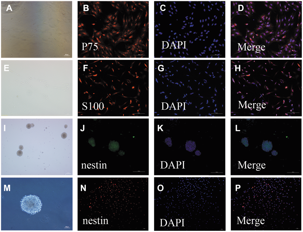 Primary NSCs were cultured for seven days, after which the cells were aggregated into suspended spheres for growth. These cells had a regular spherical shape with a dark center and bright edges (Figure 1I, 1M). Immunofluorescent staining of these cells was then performed using a nestin antibody. The neurospheres were positive for nestin, suggesting that they were NSCs (Figure 1J–1L, 1N–1P).