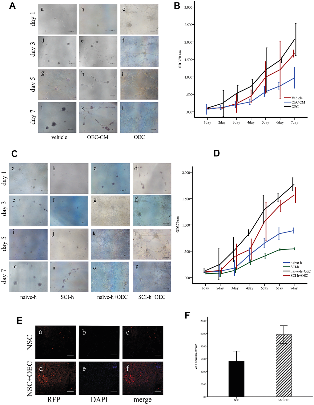 Next, we investigated the effects of the SCI microenvironment on the survival of NSCs and whether OECs could improve NSC survival in this microenvironment. NSC cultures were treated with homogenate (100 μg/mL) from the injured (SCI-h) or naïve (naïve-h) spinal cord and OECs (SCI-h+OECs or naïve-h+OECs) were also added to these cultures for seven days. The morphologies of the cells were observed under an inverted microscope every other day (Figure 2C). We found that NSCs cultured with naïve-h homogenate aggregated into suspended cellular spheres for growth. After seven days in culture, both the number and volume of cellular spheres increased, but the cells did not differentiate. However, the proliferation of NSCs in the SCI-h group was slowed compared to that in the naïve-h group, and the number and diameter of clone pellets were not significantly increased after five days of culture. After co-culturing with OECs for one day, all the cells adhered to the wall and formed a network with long protuberances, and this continued until the fifth day. MTT assays showed that NSC proliferation in the SCI-h group was significantly inhibited compared with that in the naïve-h group; in contrast, the number of cells in the SCI-h+OEC group was increased significantly compared with that of the other groups (Figure 2D).
