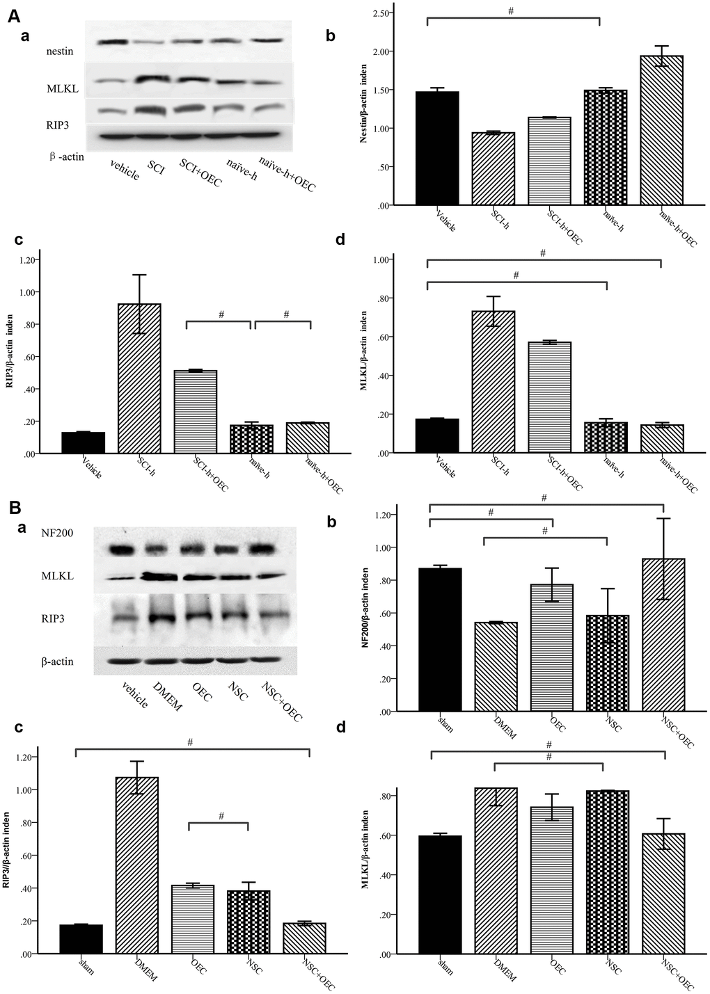 To determine whether OECs can inhibit necroptosis of NSCs induced by the SCI microenvironment, we treated NSCs with SCI-h or naïve-h, as well as with OECs, for seven days. Protein levels of nestin, MLKL, and RIP3 were assessed via Western blotting. As shown in Figure 3A, compared with those in the naïve-h group, RIP3 and MLKL levels were increased while nestin was reduced in the SCI-h group, which indicated activation of necroptosis in the SCI microenvironment and death of NSCs. Moreover, the expression levels of RIP3 and MLKL were significantly down-regulated when NSCs were treated with OECs (Figure 3A). To further elucidate changes in NSCs within the spinal cord following SCI, we transplanted OECs and/or NSCs into SCI rats and subsequently measured protein levels of RIP3, MLKL, and neurofilament 200 (NF200) via Western blotting (Figure 3B). Two weeks after transplantation, RIP3 and MLKL protein levels in the control group (i.e., incubated only in Dulbecco’s modified eagle medium [DMEM]) were still increased, indicating that necroptosis continued beyond two weeks after injury. Compared with those in the DMEM group and NSC group, the expression levels of RIP3 and MLKL were significantly lower in the OEC group and OEC+NSC group, which showed that OEC transplantation inhibited SCI-induced necroptosis. Compared with that in the NSC group, NF200 expression was significantly increased in the OEC+NSC group, suggesting that OECs played a neuroprotective role by inhibiting RIP3/MLKL-mediated necroptosis.