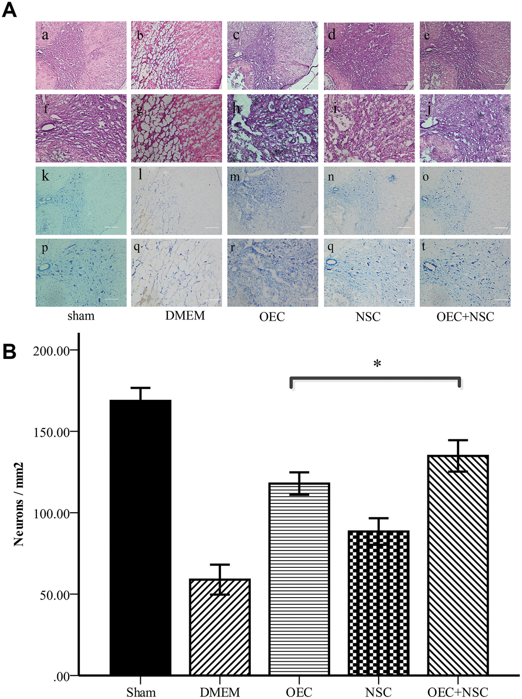 Furthermore, we sought to determine whether the protective effects of OECs on grafted NSCs could improve the therapeutic efficacy of cell transplantations. We observed HE and Nissl staining of spinal-cord tissue at two weeks after cell transplantations, and the result showed that OECs reduced the formation of cavities and loss of neurons following SCI. These findings suggest that OEC transplantation can prevent necroptosis of different cell types within the spinal cord, thus providing a neuroprotective effect and improving various pathological conditions after SCI.