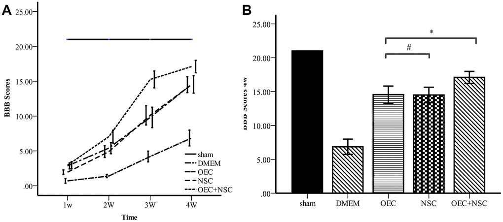 The BBB 21-point open-field locomotor rating scale was used for evaluating hindlimb movements. Rats were placed on a circular platform with a diameter of 2 m. Walking and hindlimb movement scores were observed and recorded. In the first stage (0–7 points), joint movement of the hindlimb was scored. In the second stage (8–13), scores were judged according to gait and hindlimb coordination. In the third stage (14–21 points), points were scored based on the movement of the claws. The three stages comprised a total of 21 min. Rats were evaluated at one, two, three, and four weeks after transplantation.