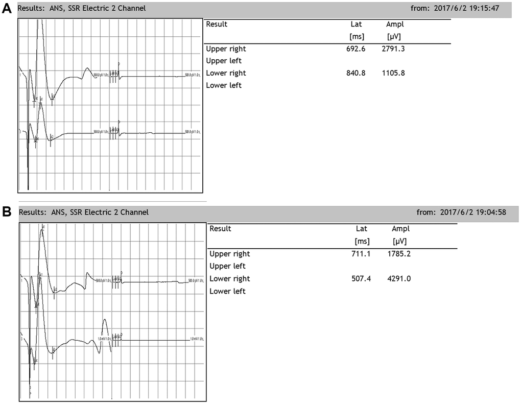 Rats exhibit SSRs that can be determined by electromyography. The resulting SSR waveforms are similar to those observed in humans, consisting of a biphasic or triphasic wave (although the biphasic wave occurs most frequently). Generally, an SSR consists of a low-amplitude negative wave followed by a high-amplitude positive wave. In our present study, when the median nerve was stimulated, SSRs were elicited from both the upper and lower limbs. There was no significant difference in the amplitudes or latencies between the two upper or lower limbs. However, there were significant differences in the latencies and amplitudes between the upper and lower limbs, which were similar when the tibial nerve was stimulated (Figure 6).