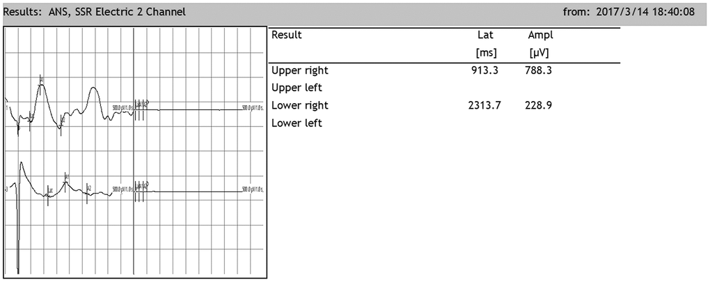 Autonomic function was evaluated by SSRs. SSRs were recorded by the Keypoint-4 Electromyography Evoked Potential System (Medtronic; Minneapolis, Minnesota, USA). SSRs were determined for both upper limbs and lower limbs and were evoked by electrical stimulation (0.2-ms duration, 1-Hz frequency, 0.5-mV/D sensitivity). The recording electrodes were placed on the plantar surface of each foot and the palm of each hand, and the references were placed on the dorsum of the foot and hand. The tibial nerve was stimulated using a saddle electrode in the medial malleolus, while the median nerve was stimulated in the midline of the wrist using the same electrode. The stimulus intensity was initially 40 mA, and was then increased to 60 mA. All rats were administrated four stimuli until a stable waveform was observed. The interval between stimuli occurred at random intervals of more than 1 min each to avoid habituation. The SSR latencies and amplitudes were recorded at 1 d before transplantation, as well as at four weeks after transplantation.