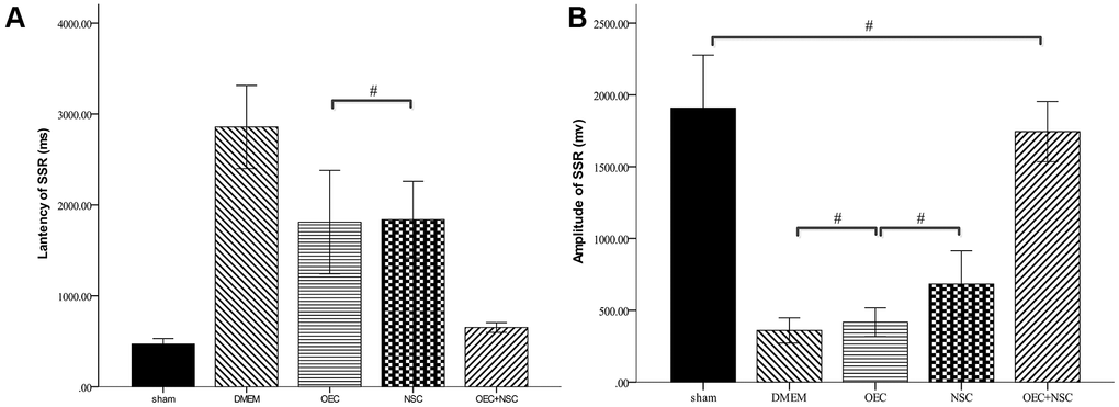 | There was no significant difference in latency between the OEC and NSC groups, #P=1.00, Pairwise comparison of other groups p value < 0.01(means ± SEM; one-way ANOVA, post-hoc:Dunn-Bonferroni; Error bar: 95% CI); There was no significant difference in amplitude between the OEC+NSC group and sham group and between the DMEM group, OEC group and the OEC group (P=1.00), Pairwise comparison of other groups p value < 0.01(means ± SEM; one-way ANOVA, post-hoc:Dunn-Bonferroni; Error bar: 95% CI). | |||||||||||||||||||||||||||||||||||||||||||||||||||||||||||||||||||||||||||||||||||||||||||||||||||