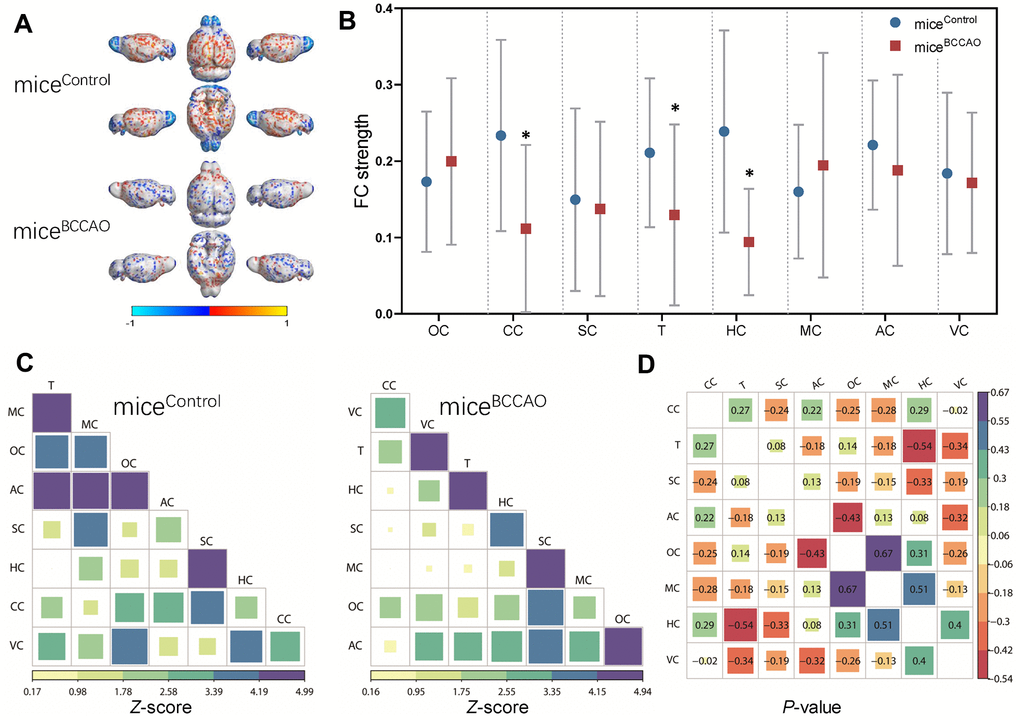 Next, we compared the brain ROIs based on rs-fMRI to evaluate the effect of BCCAO microbiota colonization on the brain FC patterns. The ROIs were chosen based on the results of rs-fMRI and included auditory cortex (AC), cingulate cortex (CC), hippocampus (HC), motor cortex (MC), orbitofrontal cortex (OC), somatosensory cortex (SC), thalamus (T), and visual cortex (VC). The functional connections between these ROIs are shown in the virtual graphs (Figure 3A). The results show decreased FC in the cingulate cortex, hippocampus, and thalamus of miceBCCAO compared to control mice (Figure 3B). We found no changes in FC correlation analysis between each ROIs in the correlation matrices (Figure 3C, 3D). These data indicated that BCCAO microbiota colonization decreased the brain FC in miceBCCAO.