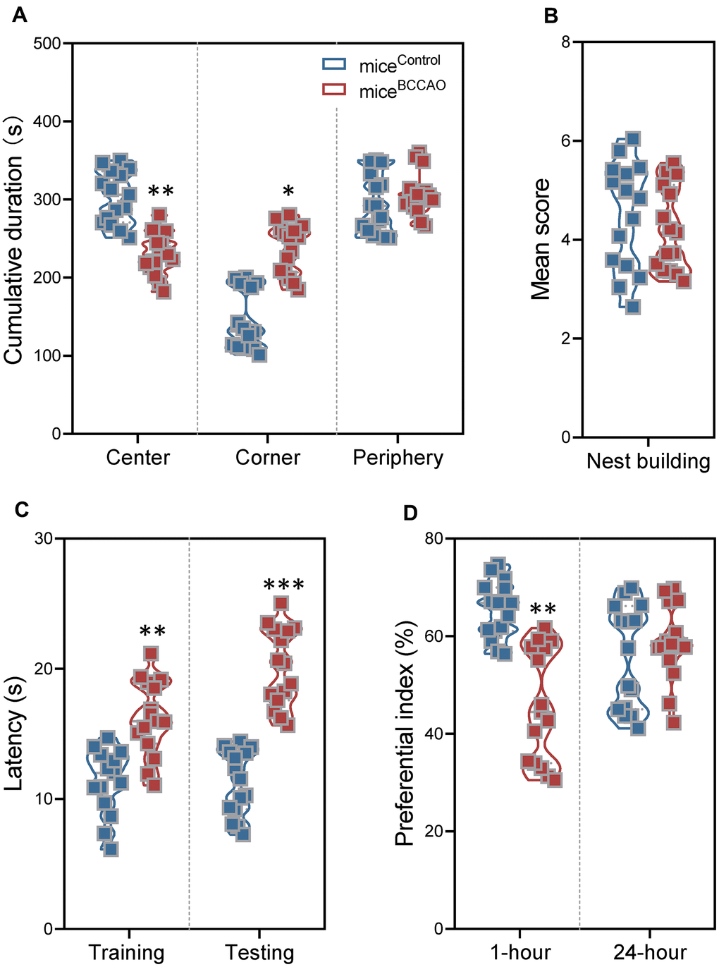 Next, we explored the effect of mouse BCCAO microbiota on the behavior of healthy mice. In the open field test (OFT), we assessed the spontaneous locomotor activity. Compared to control mice, miceBCCAO spent more time in the corners, and less time in the center (Figure 4A). There was no difference in the time spent in the periphery arena. The increased time spent in the corners in miceBCCAO indicated increased anxiety. The crunching of harmless objects, such as cotton or soft papers to build a nest, has been associated with compulsive or natural behavior. However, the nest building test did not show any differences in nest building scores between micecontrol and miceBCCAO (Figure 4B).