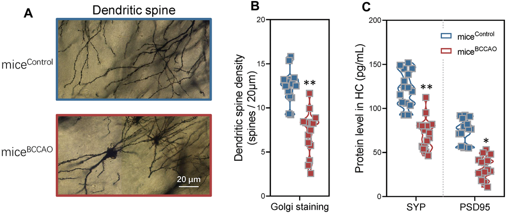 To investigate the effect of BCCAO microbiota colonization on hippocampal neuronal plasticity, we assessed dendritic spine density with the Golgi staining. Golgi staining displayed neuropathological modifications in the hippocampal region in miceBCCAO (Figure 5A), and indicated a significant decrease in the dendritic spine density in the hippocampus of BCCAO microbiota-colonized mice (Figure 5B). Moreover, the levels of synaptophysin (SYP) and PSD95 were significantly decreased in the hippocampal region in miceBCCAO (Figure 5C).