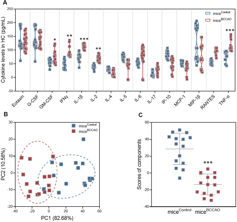 Because of the observed differences in hippocampal neuronal plasticity, we next assessed the levels of pro-inflammatory cytokines G-CSF, GM-CSF, IL-1β, IL-2, IL-4, IL-5, IL-6, IL-17, IFNγ, IP-10, TNF-α, RANTES, MCP-1, eotaxin, and MIP-1β in the hippocampus by multiplex bead analysis. MiceBCCAO had significantly increased levels of pro-inflammatory cytokines, including GM-CSF, IFNγ, IL-1β, IL-2, and TNF-α (Figure 6A). Principal component analysis (PCA) revealed that PC1 and PC2 grouped mice formed two distinct clusters (Figure 6B). To further investigate the effect of BCCAO microbiota colonization on neuroinflammation, average PCA scores were graphically illustrated (Figure 6C). This illustration revealed that the average neuroinflammation score was significantly different between micecontrol and miceBCCAO, indicating increased neuroinflammation in miceBCCAO.