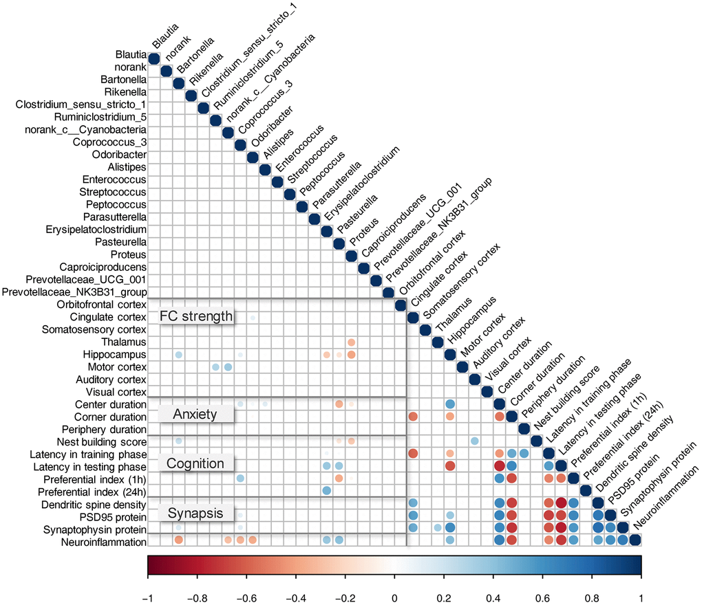 We investigated whether the microbiota changes described above (Figure 2) correlated with changes in behavioral and neurobiological characteristics, such as anxiety, cognition, fMRI measured FC, hippocampal neuronal plasticity, and neuroinflammation. The results are illustrated in Figure 7 (P < 0.01). FC strength of the cingulate cortex showed a positive correlation with the relative abundance of Odoribacter. Thalamus showed a negative correlation with the relative abundance of Proteus. Hippocampus showed a positive correlation with the relative abundance of Bartonella, Coprococcus_3, and a negative correlation with Erysipelatoclostridium, Pasteurella, and Proteus. The motor cortex showed a negative correlation with Ruminiclostridium_5 and norank_c_Cyanobacteria. In anxiety-like behavior, the time spent in the center of the open field showed a positive correlation with Coprococcus_3, Enterococcus, and a negative correlation with Pasteurella and Proteus. In cognitive behavior, nest building ability showed a positive correlation with Bartonella, and a negative correlation with Caproiciproducens and Proteus. Latency in the testing phase of the MWM test showed a positive correlation with Pasteurella and Proteus. Preferential index with 1-hour interval between training and testing phase showed a positive correlation with Coprococcus_3, and a negative correlation with Pasteurella. The preferential index (24 h) showed a positive correlation with Erysipelatoclostridium. In hippocampal neuronal plasticity, the levels of PSD95 protein showed a positive correlation with Coprococcus_3. The SYP protein showed a positive correlation with Bartonella and Coprococcus_3. The neuroinflammation status in the hippocampus showed a negative correlation with Bartonella, norank_c_Cyanobacteria, Coprococcus_3, and Odoribacter, and a positive correlation with Erysipelatoclostridium and Pasteurella.