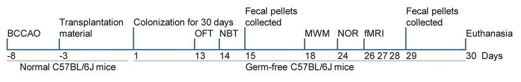 In total, forty male normal C57BL/6J mice (2-3 months of age) and 30 male germ-free C57BL/6J mice (1 month of age) were used in the study, blinded control. The study schedule is shown in Figure 8. The mouse model of repeated cerebral I/R injury was caused by BCCAO on day -8 of the test. The bacterial transplant material was organized from day -3 to 0. Germ-free mice were colonized with microbiota from BCCAO mice (miceBCCAO) or sham-operated mice (micecontrol) microbiota on day 1 via oral gavage for 30 days. The germ-free control group was colonized with gut microbiota from the micecontrol group. On day 15 and 29, fresh fecal pellets were amassed between 9 a.m.to10 a.m., snap-frozen, and stored at -80° C till use. On day 26-28, MRI continuously scanned the animals in random order. On day 30, after the behavioral and MRI tests, mice were positioned in a closed chamber and euthanized by isoflurane inhalation and cervical dislocation to collect hemisphere, hippocampus, and plasma. All samples were saved in a 4% paraformaldehyde solution or at -80° C until use.