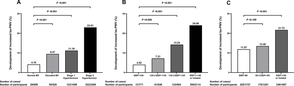 After a median of 4.3 years’ follow-up, 724 participants developed an increased ba-PWV (Figure 1), which was defined as a normal ba-PWV at baseline (≤1793 cm/s, i.e. the 75th percentile of baseline ba-PWV) and an increased ba-PWV at follow-up (>1793 cm/s). Proportions of participants developing arterial stiffness were 4.15%, 9.47%, 11.19%, and 23.01% in groups of normal BP, elevated BP, stage 1 hypertension, and stage 2 hypertension, respectively. Significant differences were found for the development of arterial stiffness between participants with stage 1 hypertension and participants with normal BP, or between participants with systolic BP 130~139 mmHg and participants with systolic BP <120 mmHg (both P <0.001). However, no difference was found between participants with diastolic BP 80~89 mmHg and participants with diastolic BP <80 mmHg (P = 0.189).