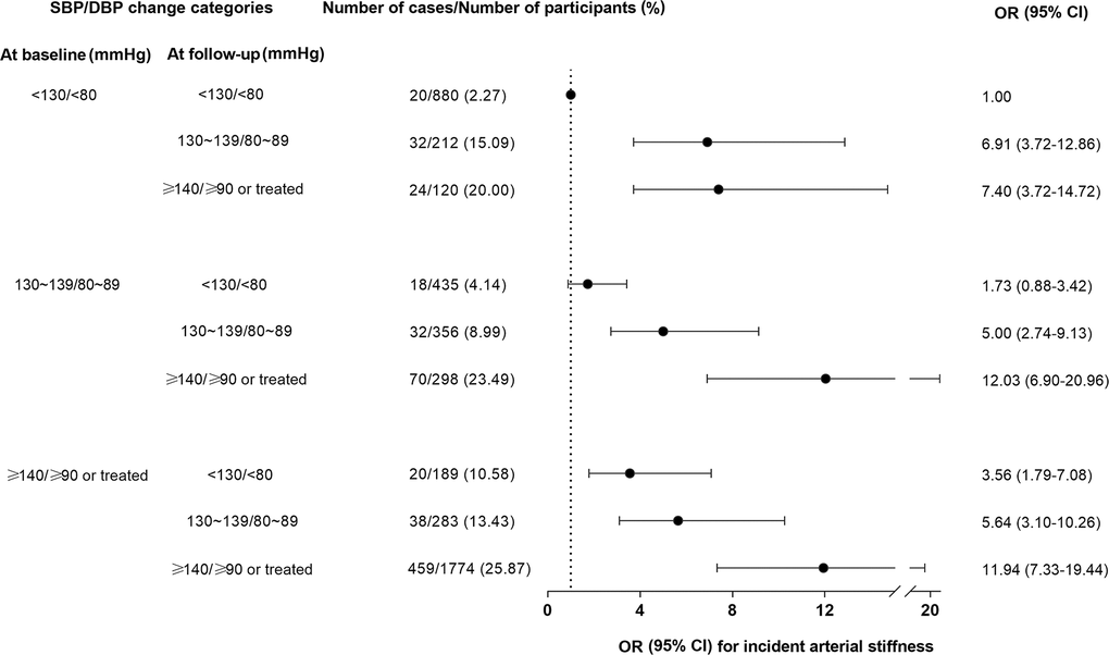 Further categorization using both baseline BP and follow-up BP and their associations with arterial stiffness are shown in Figure 2. Using participants with systolic BP <130 mmHg and diastolic BP <80 mmHg at both baseline and follow-up as the reference, participants whose BP levels were <130/<80 mmHg at baseline and 130~139/80~89 mmHg at follow-up had a 5.91-fold increased risk of arterial stiffness (OR =6.91; 95% CI =3.72-12.86, P<0.001). For participants with BP levels 130~139/80~89 mmHg at baseline, significantly increased risks of arterial stiffness were found for BP levels 130~139/80~89 mmHg or higher at follow-up.