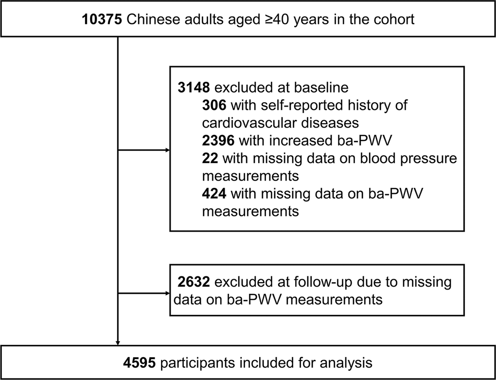 The study was conducted among the residents living in Jiading District, Shanghai, China. The study design has been published elsewhere [29]. In 2010, 10375 registered permanent residents aged 40 years or older were recruited for a comprehensive examination of cardiometabolic health. During 2014 to 2015, participants were asked to come back for a follow-up visit. For the current analysis, we excluded 306 participants with self-reported history of CVD and 22 participants with missing data on BP measurements at baseline. We further excluded participants with missing data on ba-PWV at baseline or at follow-up and participants with already increased baseline ba-PWV levels. Eventually, 4595 participants were included for the current analysis. Details of the study population selection are presented in Figure 3.