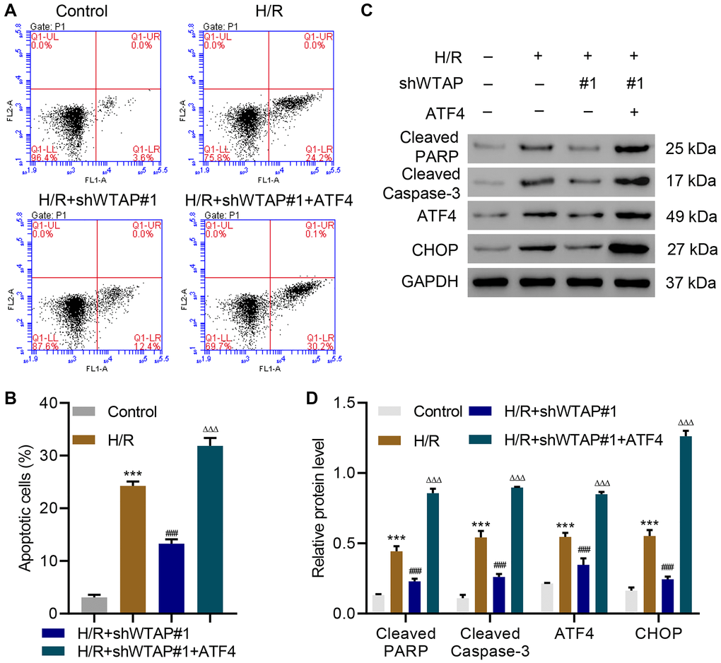 To explore how WTAP silencing inhibits H/R-induced injury, ATF4 was successfully overexpressed in WTAP-silenced AC16 cells (Supplementary Figure 2) and the cells underwent H/R. Flow cytometry analysis showed that WTAP silencing significantly inhibited H/R-induced apoptosis, which was reversed by overexpression of ATF4 (Figure 3A, 3B). Western blots confirmed that WTAP silencing significantly inhibited H/R-induced expression of cleaved PARP, cleaved Caspase-3, ATF4 and CHOP, which was also reversed by overexpression of ATF4 (Figure 3C, 3D). The findings showed WTAP knockdown inhibited H/R-induced injury in AC16 through suppression of ATF4.