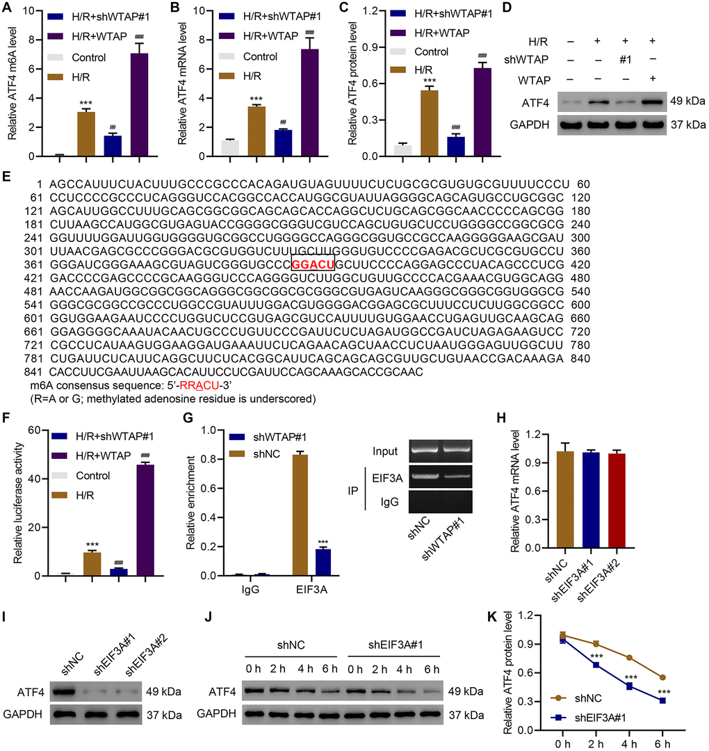 To understand how ATF4 is involved in the WTAP regulation of H/R-induced injury, we first analyzed ATF4 5′UTR m6A levels in control cells, WTAP-silencing AC16 cells, and WTAP-overexpressing AC16 cells with or without H/R. Results showed that silencing of WTAP significantly inhibited H/R-induced ATF4 5′UTR m6A levels. In contrast, overexpression of WTAP sharply increased H/R-induced ATF4 5′UTR m6A levels (Figure 4A). qPCR and immunoblotting results suggested silencing of WTAP significantly downregulated ATF4 while overexpression of WTAP significantly upregulated ATF4 (Figure 4B–4D). Then, we did a bioinformatic analysis and found a potential bind site of EIF3A in ATF4-5′UTR (Figure 4E). Therefore, we performed luciferase assay of EIF3A and ATF4-5′UTR interaction. Results showed that silencing of WTAP significantly decreased H/R-induced increase in luciferase activity of ATF4-5′UTR while overexpression of WTAP further increased luciferase activity of ATF4-5′UTR in H/R-treated cells (Figure 4F). We then performed RIP and qRT-PCR and confirmed that EIF3A directly binds to ATF4 mRNA (Figure 4G). To verify these results, EIF3A was successfully silenced in AC16 cells (Supplementary Figure 1). Silencing of EIF3A did not affect the expression of ATF4 at the mRNA level (Figure 4H), but significantly decreased the protein level of ATF4 (Figure 4I). Then, control cells or EIF3A-silencing cells were treated with CHX (100 μg/ml), a protein synthesis inhibitor, to evaluate the effect of EIF3A on protein stability of ATF4. Results showed that silencing of EIF3A time-dependently decreased ATF4 protein level (Figure 4J, 4K). The data indicated WRAP directly targets ATF4.