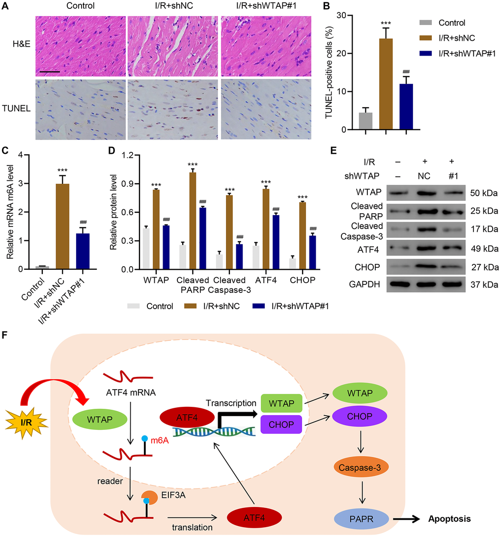After injecting WTAP shRNA vector or its negative control (shNC) to the rats, cardiac function indexes are shown in Table 1. I/R significantly decreased ejection function (EF), fractional shortening (FS), and systolic blood pressure, which was reversed by WTAP knockdown. After I/R, the myocardium was harvested. HE staining and TUNEL staining showed that silencing of WTAP significantly ameliorated I/R induced myocardial cell apoptosis (Figure 6A, 6B). ELISA results suggested that silencing of WTAP decreased I/R-induced m6A levels (Figure 6C). Silencing of WTAP also reduced I/R-induced upregulation of cleaved PARP, cleaved Caspase-3, ATF4 and CHOP in myocardial cells (Figure 6D, 6E). These results indicated that WTAP knockdown reduced cardiac I/R injury in vivo.