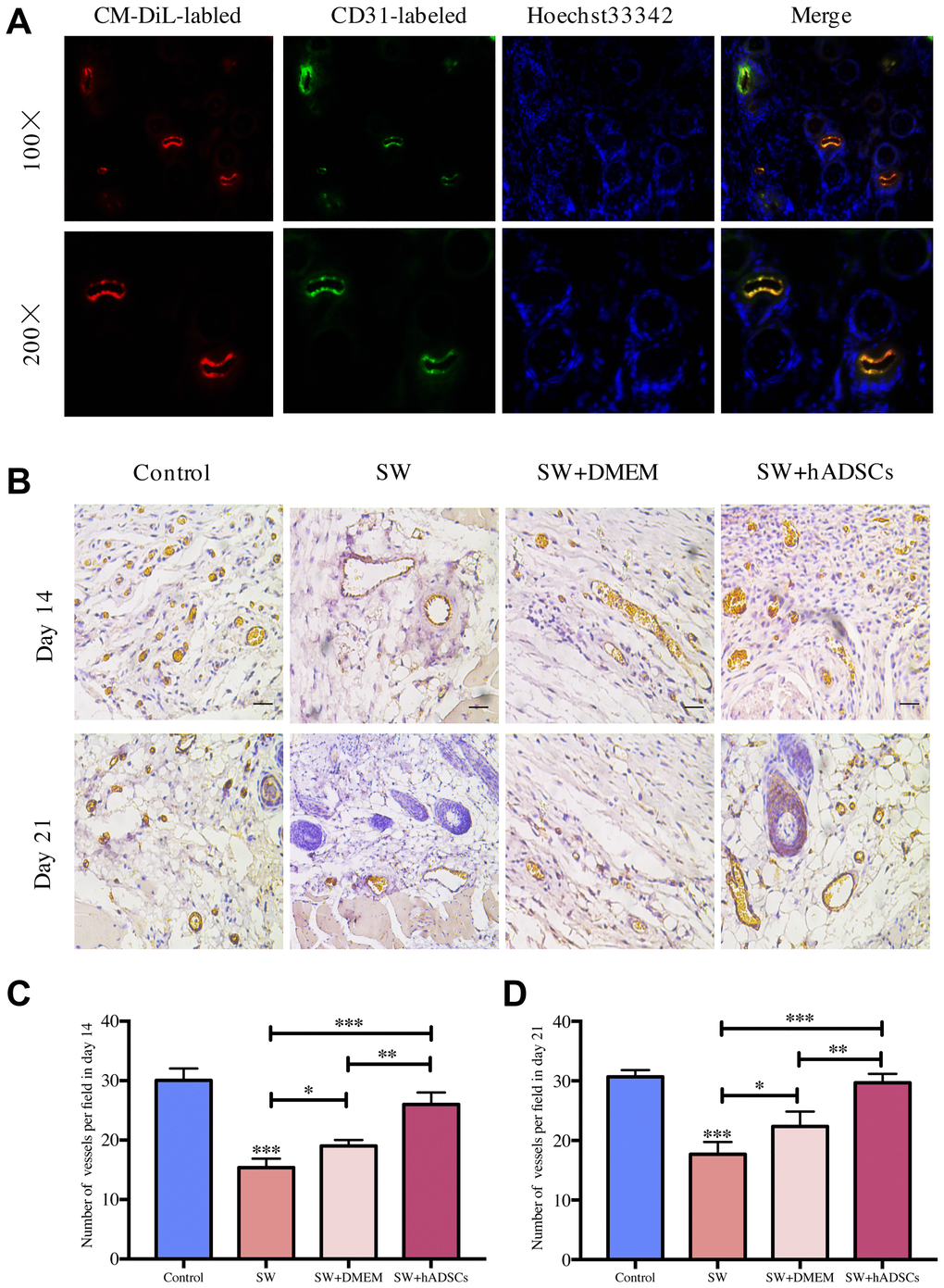To observe the differentiation effects of hADSCs, the cells used for injection therapy were labeled with red fluorescence with CM-DiL fluorescent dye (Invitrogen, Thermo Scientific, USA) in advance. On the day 14 after injection treatment, wounded skin tissues of the SW + hADSCs group were immediately excised and frozen sections of 10 μM were prepared. Frozen sections were dried for 15 min at room temperature, then soaked for 10 min in PBS solution to remove tissue glue and incubated with CD31 antibody (10 μg/mL, R&D Systems, USA) at 4°C overnight. FITC-labeled goat anti-mouse IgG (H + L) cross-adsorbed secondary antibody (Beyotime Biotechnology Company, Jiangsu, China) and 1X Hoechst33342 (Ribo, Guangzhou, China) were incubated with the slices for 4 h and 30 min, respectively. The slices were then washed with PBS and mounted with antifade mountant (ProLong, Thermo Scientific, USA). Images were acquired using a Zeiss fluorescence microscope (HLA100, Shanghai, China).