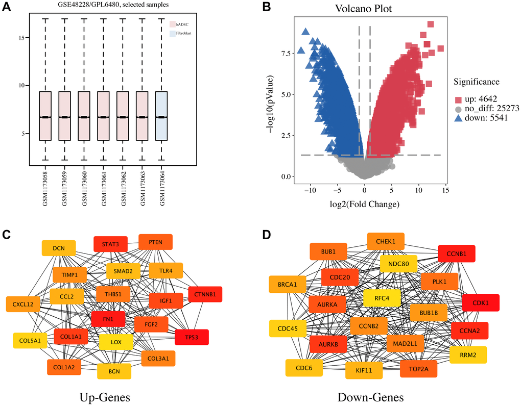 The gene expression microarray dataset (GSE48228), comprised of samples from six hADSCs, one fibroblast, and one endothelial cell, was downloaded from the Gene Expression Omnibus (GEO) database (https://www.ncbi.nlm.nih.gov/geo). The dataset was based on the GPL6480 platform (Agilent-014850 Whole Human Genome Microarray), and the mRNA expression data of hADSCs and fibroblast control were downloaded and used for this study. The platform data were converted using R language software and standardized using the limma R package’s array function (http://www.bioconductor.org/). The differential analysis of mRNAs in hADSCs compared with fibroblasts was performed using the GEO2R analysis tool. An mRNA with a p value of < 0.05 and a base-2 log FC value greater than ± 2 was defined as a DEG, and the integrated DEG lists of upregulated and downregulated genes were saved for subsequent analysis.
