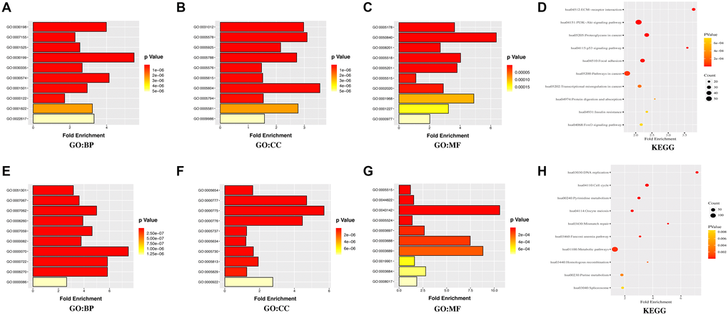 Furthermore, the database for annotation, visualization, and integrated discovery (DAVID) was used for gene ontology (GO) annotation and the Kyoto Encyclopedia of Genes and Genomes (KEGG) pathway analysis to further reveal the enrichment status of DEGs in the molecular functions (MFs), biological processes (BPs), cell components (CCs), and pathways. Regarding BPs (Figure 3A, 3E), the upregulated DEGs were mainly involved in GO:0030198 (extracellular matrix (ECM) organization), GO:0007155 (cell adhesion), and GO:0001525 (angiogenesis), while the downregulated DEGs were mainly involved in GO:0051301 (cell division), GO:0007067 (mitotic nuclear division), and GO:0007062 (sister chromatid cohesion). Regarding CCs (Figure 3B, 3F), the majority of upregulated DEGs were components of GO:0031012 (ECM), GO:0005578 (proteinaceous ECM), and GO:0005925 (focal adhesion), whereas the downregulated DEGs were mainly components of GO:0005654 (nucleoplasm), GO:0000777 (condensed chromosome kinetochore), and GO:0000775 (chromosome, centromeric region). For the MFs (Figure 3C, 3G), the upregulated DEGs were mainly involved in GO:0005178 (integrin binding), GO:0050840 (ECM binding), and GO:0008201 (heparin binding), whereas the downregulated DEGs were mainly involved in GO:0005515 (protein binding), GO:0044822 (poly(A) RNA binding), and GO:0043142 (single-stranded DNA-dependent ATPase activity). KEGG pathway analysis was used to define the pathways and functions of the DEGs (Figure 3D, 3H). Most upregulated DEGs were significantly enriched in hsa04512 (ECM-receptor interaction), hsa04151 (phosphoinositide 3 kinase (PI3K)-Akt signaling pathway), and hsa05205 (proteoglycans in cancer), whereas the downregulated DEGs were mainly enriched in hsa03030 (DNA replication), hsa04110 (cell cycle), and hsa00240 (pyrimidine metabolism).