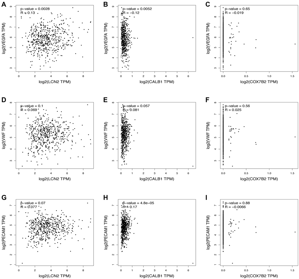 The top three most upregulated or downregulated DEGs with protein-coding functions and the top five hub genes were selected, and the correlations between the DEGs and hub genes and the markers of angiogenesis, necroptosis, pyroptosis, ferroptosis, and anti-inflammatory activities in skin tissue were further analyzed using the GEPIA database. Notably, the vascularization correlation results of the upregulated DEGs and hub genes (Figure 4 and Supplementary Figure 1) suggested that almost all upregulated DEGs and hub genes were strongly positively correlated with vascularization markers (P < 0.001, R > 0). Regarding the downregulated DEGs (Figure 5), most were not significantly correlated with vascular markers. However, LNC2 was positively correlated with VEGFA expression (P ≤ 0.01, R = 0.13). CALB1was negatively correlated with VEGFA (P < 0.01, R = –0.12) and positively correlated with PECAM1 (P < 0.001, R = 0.17). Regarding the downregulated hub genes, almost all were positively correlated with VEGFA (P < 0.05, R > 0; Supplementary Figure 2A–2E). Interestingly, all downregulated hub genes were strongly negatively correlated with VWF and PECAM1 (P < 0.001, R < 0; Supplementary Figure 2F–2O).
