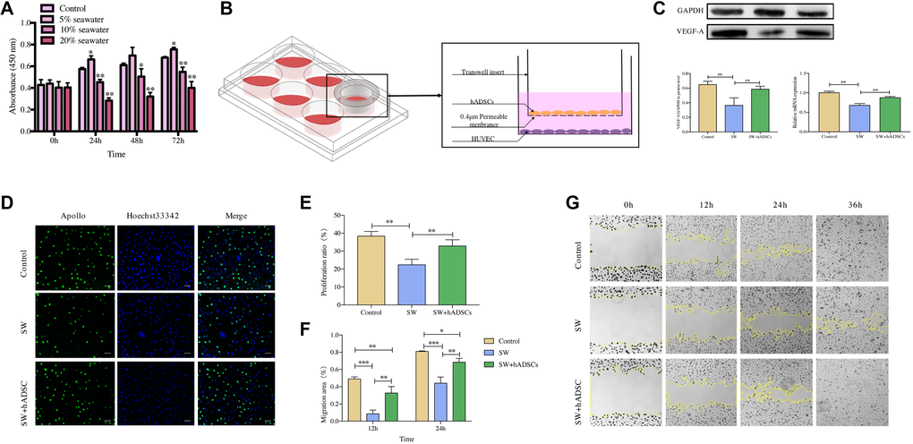 To explore the effect of the co-culture of seawater and hADSCs on cell proliferation. HUVECs were seeded into 96-well plates at a density of 2000 cells/well. After the cells were cultured for 12 h, the medium was replaced with a high-glucose culture medium containing different proportions of seawater (volume fractions of 5%, 10%, and 20%) for 24, 48, or 72 h. Artificial seawater was configured as previously reported. At each observation time point, 10 μL of CCK8 reagent (Beyotime Biotechnology Company, Shanghai, China) was added to each well and incubated for 2 h. At the end of incubation, absorbance was measured at 450 nm using an enzyme-labeled instrument (Tecan, Shanghai, China).