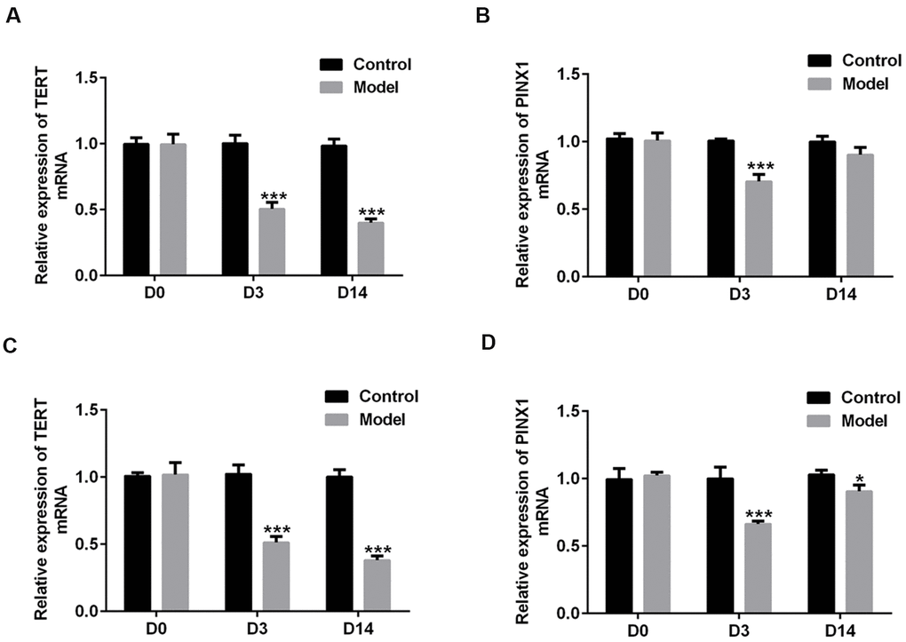 To explore the roles of TERT and PINX1 in the acute stage and convalescent phase of lung injury rats induced by LPS, the expression of both TERT and PINX1 in serum and lung tissues of rats was detected using RT-qPCR on D3 and D14. As shown in Figure 1A, 1B, TERT level in serum was persistently reduced on D3 and D14 compared with the control group, while PINX1 expression was decreased on D3, but increased on D14 compared to D3. Both TERT and PINX1 expression in lung tissues exhibited the same variation trends as that in serum (Figure 1C, 1D). These data revealed that the levels of TERT and PINX1 presented different changes from the acute stage to convalescent phase of rats with lung injury.