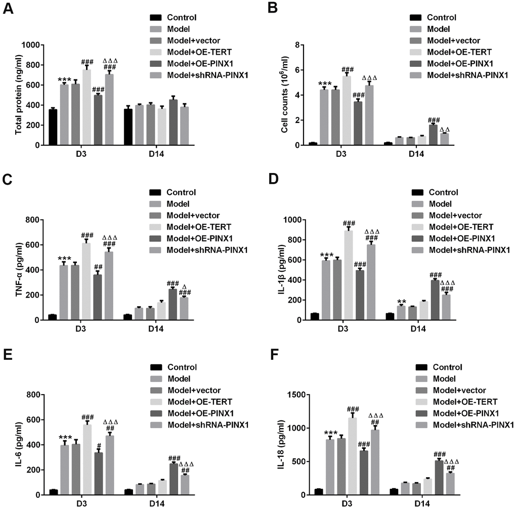 The total proteins in BALF of rats in each group were examined using commercial kits. As exhibited in Figure 3A, 3B, the content of total proteins and the inflammatory cell count on D3 in the model group were significantly increased, which were further enhanced after TERT overexpression or PINX1 silencing. Conversely, PINX1 upregulation dramatically decreased them as compared to the model+vector group. Subsequently, the levels of above-mentioned indicators in BALF on D14 after the model establishment were tested. As could be observed in Figure 3A, 3B, the total protein and the inflammatory cell count were reduced overall compared with those on D3. Differently, the total protein and the number of inflammatory cells in the TERT overexpression group and the PINX1 silencing group were significantly reduced on D14, whereas PINX1 overexpression presented the highest levels of protein content and inflammatory cell count. Consistently, results of the levels of inflammatory factors including TNF-α, IL-1β, IL-6, and IL-18 in different groups shown the same variation trends as the total protein and the number of inflammatory cells (Figure 3C–3F). To sum up, above data demonstrated that TERT overexpression or PINX1 silencing exacerbated inflammatory response in the acute phase while promoted the recovery of inflammatory injury in the convalescent phase, whereas PINX1 overexpression presented the opposite effects.