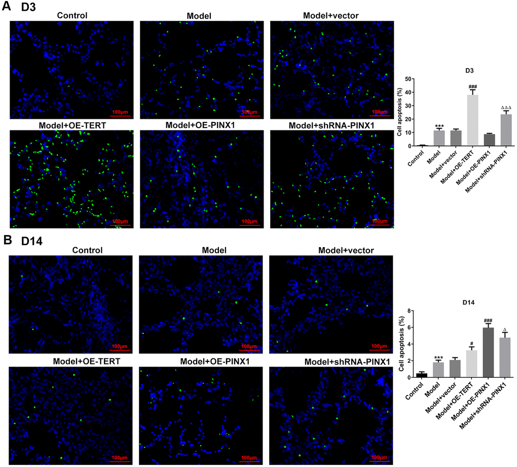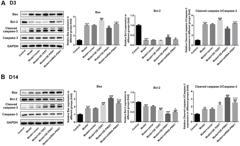 TUNEL staining was employed to assess apoptosis on D3 and D14. As displayed in Figure 4A, cell apoptosis was dramatically enhanced in the model group relative to the control group. After TERT upregulation or PINX1 downregulation, apoptosis aggravated, whilst PINX1 overexpression showed the lowest level of apoptosis on D3. However, cell apoptosis was significantly decreased on D14, but different groups exhibited different degrees (Figure 4B). The TERT overexpression group and the PINX1 silencing group exhibited low levels of apoptosis, while the PINX1 overexpression group showed the most obvious apoptosis on D14. Concurrently, the expression of apoptosis-related proteins was determined using western blot analysis. Results in Figure 5A indicated that the expression of Bax and cleaved caspase-3 was notably upregulated accompanied by obviously downregulated Bcl-2 expression on D3 after TERT overexpression or PINX1 silencing, compared with the model+vector group. By contrast, PINX1 overexpression dramatically decreased the levels of Bax and cleaved caspase-3 while increased that of Bcl-2. Moreover, on D14, TERT overexpression or PINX1 silencing presented significant decrease in Bax and cleaved caspase-3 expression coupled with an obvious increase in Bcl-2 expression (Figure 5B). Meanwhile, PINX1 overexpression exhibited the opposite effects. These findings provided a clue that TERT overexpression or PINX1 silencing aggravated apoptosis on D3 while promoted the recovery of apoptosis on D14, whereas PINX1 overexpression presented the opposite effects.