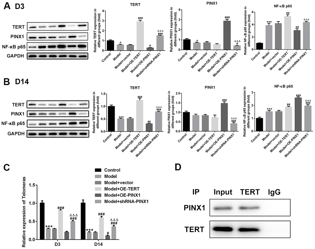 To clarify the interactions between PINX1 and TERT, the levels of both of them and NF-κB p65 on D3 and D14 were detected using western blot analysis. As shown in Figure 6A, significantly reduced TERT and PINX1 expression and elevated NF-κB p65 expression were observed in the model group relative to the control group on D3. Overexpression of PINX1 dramatically inhibited the level of TERT, whereas PINX1 knockdown backfired. Remarkably, TERT overexpression or PINX1 silencing promoted the expression of NF-κB p65 (Figure 6A). On D14, obviously decreased level of NF-κB p65 was noticed when TERT overexpression or PINX1 silencing. However, PINX1-uregulation exhibited the highest expression of NF-κB p65 in lung tissues of LPS-induced lung injury rats (Figure 6B). Moreover, the telomerase activity was measured using commercial kits. Results of Figure 6C revealed that the activity of telomerase was reduced significantly in the model group on D3 and D14, and TERT overexpression or PINX1 silencing enhanced the activity of it while PINX1 overexpression showed the lowest level of telomerase activity. The STRING website (https://string-db.org/) predicted that TERT can interact with PINX1. Co-IP assay was carried out to verify the interaction. From the results in Figure 6D, we found that there was a strong interaction between TERT and PINX1. Overall, these data suggested that PINX1 regulated the telomerase activity via directly interacting with TERT.