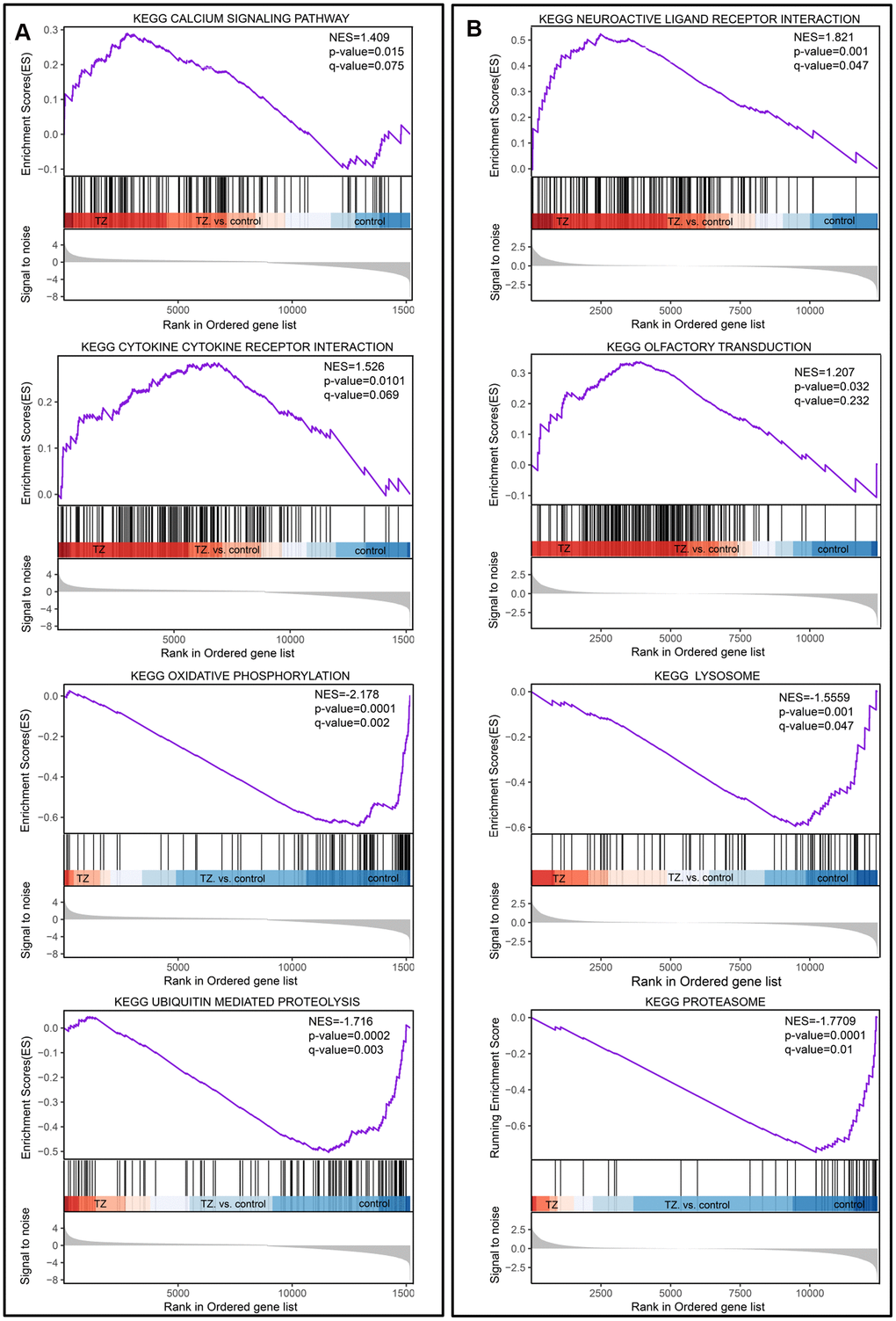 For the traditional analysis with DNA microarrays, the common approach involves focusing on a handful of genes at the top and bottom of L (i.e., those showing the largest difference) to discern telltale biological clues, but this approach has a few major limitations [33]. To overcome these analytical challenges, we used a method called Gene Set Enrichment Analysis (GSEA) that evaluates microarray data (GSE6872 and GSE6967) at the level of gene sets, and the results from the dataset GSE6872 showed that Calcium Signaling pathway and Cytokine Cytokine Receptor Interaction were enriched in the teratozoospermia samples; at the same time, Oxidative Phosphorylation and Ubiquitin Mediated Proteolysis were enriched in the control samples (Figure 1A). For the dataset GSE6967, Neuroactive Ligand Receptor Interaction and Olfactory Transduction were enriched in the Teratozoospermia samples; at the same time, Lysosome and Proteasome were enriched in the control samples (Figure 1B).