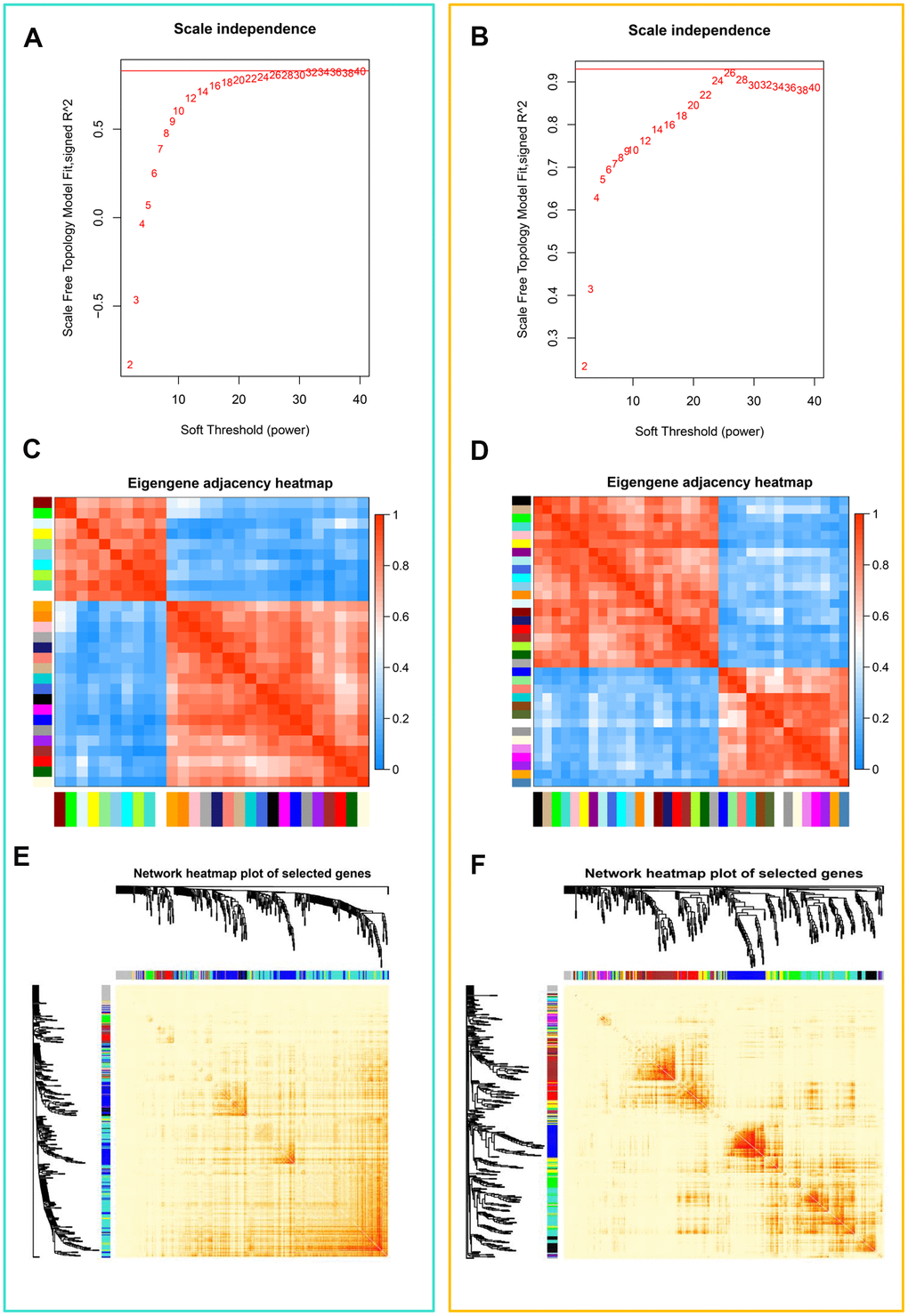 Correlation networks are being used increasingly in bioinformatics applications. To accurately elucidate the key modules and hub genes of teratozoospermia, we used WGCNA to search for clusters (modules) and associated networks of genes that are highly associated with teratozoospermia. To ensure that scale-free networks (Figure 2A, 2B) and average connectivity remained normal (data not shown), the power of β was set to 26, which indicates that our dataset analysis had a well indexed scale-free topology. As shown in Supplementary Figure 2A, 2B, the clustering effect of these two microarray-data (GSE6872 and GSE6967) was good. Gene modules were counted, with gray modules indicating genes that could not be clustered into other modules (Supplementary Figure 2C, 2D). And modules with 29 and 35 genes were identified by the Module eigengene adjacency heatmap (Figure 2C, 2D) and hierarchical clustering dendrogram (Supplementary Figure 2E, 2F), separately from dataset GSE6872 and GSE6967. The interactions between gene modules were then analyzed and a TOM plot of the gene network was generated based on the corresponding hierarchical clustering dendrogram and modules (Figure 2E, 2F).