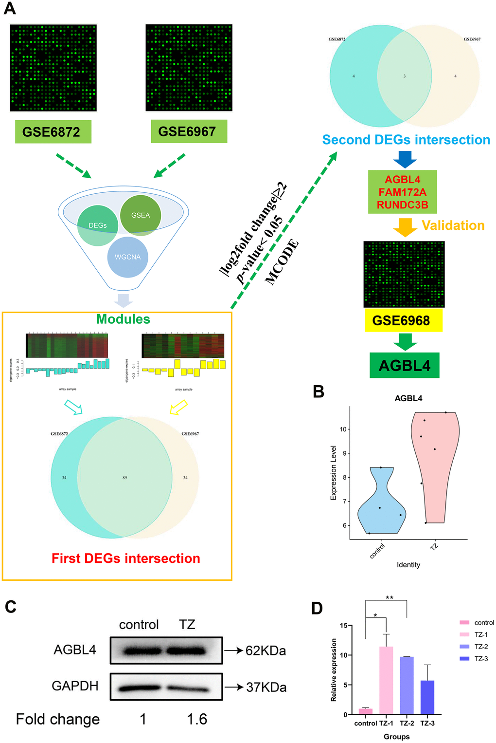 In order to verify the accuracy of the differential expression of the above three potential biomarker genes, we then substituted these three differentially expressed genes into the other dataset (GSE6968) for validation and found that only AGBL4 gene had an identical expression trend to the first two datasets (GSE6872 and GSE6967), and the result (Figure 3B) proved that the AGBL4 gene could be the diagnostic semen biomarker for teratozoospermia, which also proved the reliability of the method used in this study. In addition, the results shown in Figure 3C, 3D and Supplementary Figure 4B indicated that the expression of AGBL4 gene was significantly higher in teratozoospermia than in normal controls, further validating the potential application of this gene in the diagnosis of teratozoospermia.
