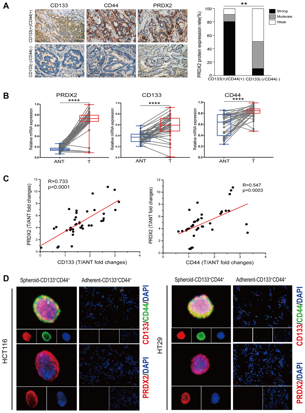 Our previous study demonstrated that PRDX2 is overexpressed in colon cancer tissues compared to adjacent noncancerous tissues [29]. In the present study, to investigate the relationship between PRDX2 expression and CD133+CD44+ CCSCs, immunohistochemical (IHC) staining was conducted to determine the expression of PRDX2 in CD133(+)/CD44(+) and CD133(-)/CD44(-) colon cancer patients. The protein expression of PRDX2 was remarkably higher and frequently upregulated in CD133(+)/CD44(+) tumor tissues compared to CD133 (-)/CD44(-) tumor tissues (Figure 1A). In addition, we further analyzed whether PRDX2 transcriptional levels correlate with CD133 and CD44 expression in 40 pairs of human colon carcinomas with matched adjacent noncancerous tissues (ANTs). As shown in Figure 1B, the mRNA expression of PRDX2, CD133 and CD44 in tumor tissues was significantly upregulated compared to that observed in ANTs tissues. Then, the expression in relationships was analyzed, which demonstrated that the mRNA levels of PRDX2 were positively associated with those of CD133 and CD44 (Figure 1C). Furthermore, PRDX2 expression in spheroid CD133+CD44+ CCSCs and adherent CD133-CD44- cells was also investigated by immunofluorescence staining. Notably, spheroid CD133+CD44+ CCSCs not only coexpressed CD133 and CD44 but also expressed PRDX2 enrichment (Figure 1D). In contrast, the adherent CD133-CD44- cells showed minimal CD133 and CD44 expression, and only scattered PRDX2 was detected in these cells (Figure 1D). Taken together, these results indicate that PRDX2 expression is closely associated with CD133+CD44+ CCSCs in colon cancer.