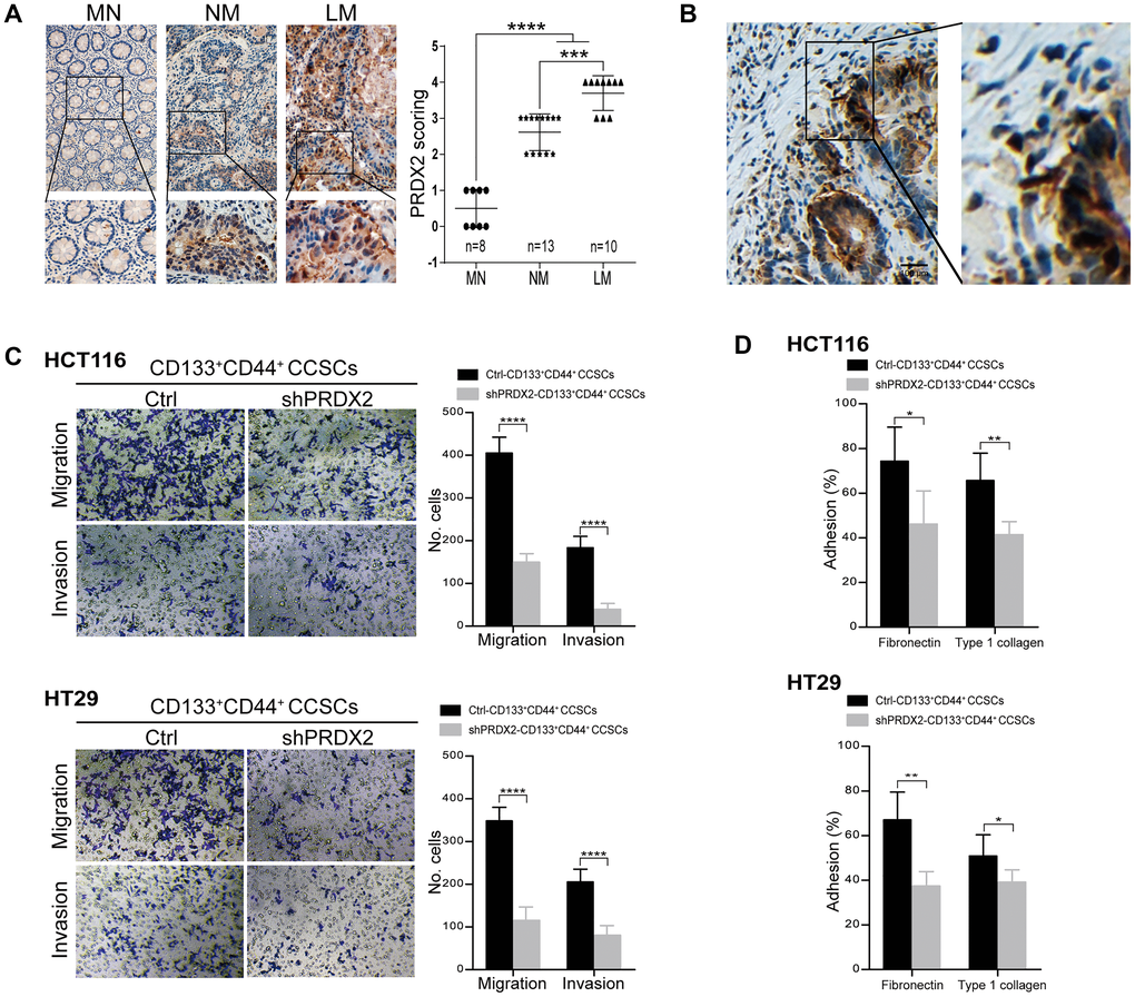 In a previous study, we provided evidence that PRDX2 expression serves as an independent and unfavorable prognostic indicator for stage I-III colorectal cancer patients [41]. However, little is known regarding the pattern of PRDX2 expression in stage IV patients. In the present study, we assessed PRDX2 expression in these patients by IHC, with 10 tumor tissues with liver metastasis collected from these individuals. The IHC results revealed that PRDX2 was highly expressed in colon cancer with liver metastasis (LM) compared to nonmetastatic tissues (NM) and matched normal colon tissues (MN) (Figure 4A). In addition, in the invasion front of tumor tissues, PRDX2 overexpression was also predominantly observed (Figure 4B). These results suggest that PRDX2 likely plays a role in tumor invasiveness. Next, based on the widely recognized view that CSCs are responsible for tumor metastasis, we assessed whether PRDX2 is functionally associated with the migration and invasion of CD133+CD44+ CSCs in vitro. The results revealed that migration and invasion was attenuated in PRDX2 knockdown CD133+CD44+ CCSCs (Figure 4C). Moreover, PRDX2 knockdown CD133+CD44+ CCSCs displayed lower adhesive capacity to fibronectin or type I collagen compared than the cells transfected with the scramble control (Figure 4D).