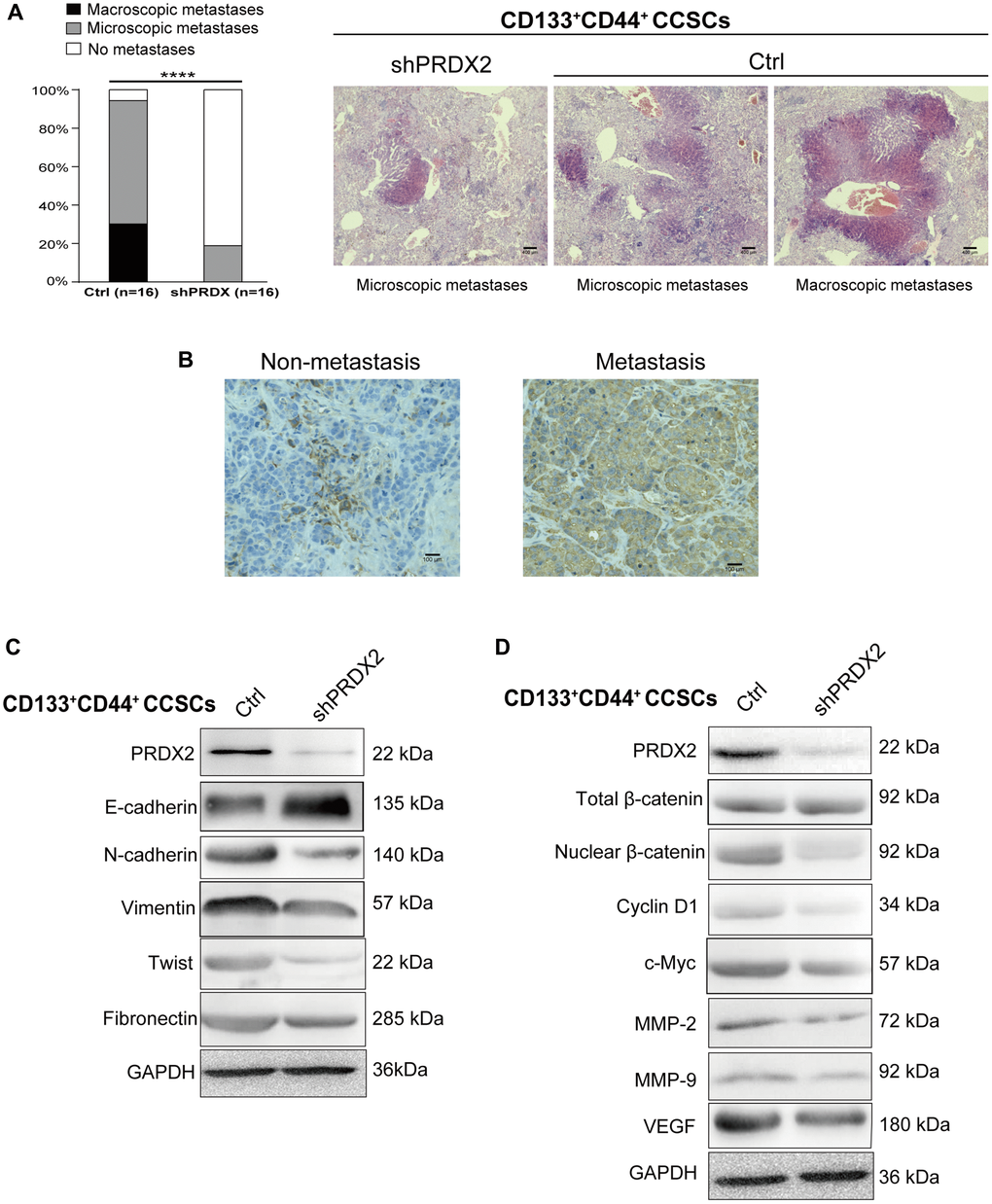 The in vitro results described above prompted us to further investigate the effect of PRDX2 knockdown on the metastasis of CD133+CD44+ CCSCs in vivo. To this end, 1 × 104 control- or shPRDX2-CD133+CD44+ CCSCs were injected into the cecal wall of 16 nude mice to establish a orthotopic tumor transplant models. After 14–18 weeks, macroscopic and microscopic analysis of the livers revealed that only mice injected with control CD133+CD44+ CCSCs developed macroscopic liver metastases, and the number of microscopic liver metastases was also significantly higher in mice injected with control CD133+CD44+ CCSCs than in those injected with shPRDX2 knockdown CD133+CD44+ CCSCs (Figure 5A). Moreover, a markedly decreased proportion of mice without any trace of liver metastases was observed in the mice injected with shPRDX2 knockdown CD133+CD44+ CCSCs (Figure 5A). In addition, the IHC results showed that PRDX2 expression was enhanced in the orthotopic tumor tissues from metastatic mice compared to tumor samples from nonmetastatic mice (Figure 5B). These data further confirmed the crucial role of PRDX2 in the metastasis of CD133+CD44+ CCSC tumors. Subsequently, we assessed whether the stem cell function-regulating role of PRDX2 in CD133+CD44+ CCSCs involves Wnt signaling and the EMT process which play crucial roles in colon cancer initiation, metastasis and stemness maintenance [42, 43]. In the EMT process, we observed that PRDX2 knockdown in CD133+CD44+ CCSCs led to a concomitant downregulation of EMT markers and the upregulation of E-cadherin (Figure 5C). Regarding, Wnt signaling, no significant change in total β-catenin expression was observed between the PRDX2-depleted CD133+CD44+ and control CCSCs. However, both intranuclear β-catenin expression and metastasis-related Wnt target gene downregulation was remarkedly decreased in PRDX2-depleted CD133+CD44+ CCSCs (Figure 5D).