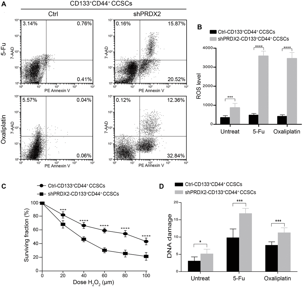 CSCs are well known to exhibit higher ROS levels than non-CSCs, which is thought to be an important cause of cancer chemoresistance [44, 45]. Thus, as PRDX2 is a crucial antioxidant gene, we were particularly interested in investigating the relationship between PRDX2 and CD133+CD44+ CCSC-induced chemoresistance. To this end, control- or shPRDX2-HCT29-CD133+CD44+ CCSCs were exposed to 500 μg/ml of 5-FU or 100 μM oxaliplatin for 24 h, and cell apoptosis was subsequently analyzed by flow cytometry with PE-labeled Annexin V containing 7-amino-actinomycin (7-AAD). In PRDX2 knockdown CD133+CD44+ CCSCs, some of these CCSCs undergoing apoptosis were in the latest stage of apoptosis after drug exposure (Figure 6A). In contrast, almost all of the control CCSCs were viable and did not undergo apoptosis, even when exposed to such high drug concentrations (Figure 6A). These findings further confirm the chemoresistance of CD133+CD44+ CCSCs and suggest that PRDX2 plays a crucial regulatory role in this process. Based on these findings, the regulatory mechanism of PRDX2 in the chemoresistance of CD133+CD44+ CCSCs was further evaluated. First, we assessed the endogenous production of ROS in control- and shPRDX2-CD133+CD44+ CCSCs with or without subsequent exposure to OXLP or 5-FU. In the absence of drug exposure, the intracellular ROS levels in PRDX2-depleted CD133+CD44+ CCSCs was more than twice as high as that observed in the control CCSCs, while a higher levels of intracellular ROS levels were also observed in PRDX2-depleted CD133+CD44+ CCSCs after exposure to OXLP or 5-FU, as determined by flow cytometry analysis (Figure 6B). Moreover, because PRDX2, as one of the most efficient intracellular H2O2 scavengers, can catalyze peroxide reduction to balance cellular hydrogen peroxide (H2O2) levels [27], we performed a clonogenic survival assays of control- and shPRDX2-CD133+CD44+ CCSCs following exposure to H2O2. Exogenous H2O2 treatment resulted in a dose-dependent reduction in cell survival (Figure 6C), which was more pronounced in PRDX2 knockdown CD133+CD44+ CCSCs than in control CCSCs (Figure 6C). Thus, these data indicate that PRDX2 knockdown in CD133+CD44+ CCSCs can sensitize these cells to oxidative stress. Because enhanced ROS levels in CSCs are consistent with increased DNA damage after exposure to chemotherapeutics [43, 46], DNA injury was evaluated through an alkaline comet assay. Our results showed that PRDX2 knockdown CD133+CD44+ CSCs displayed enhanced DNA strand breaks in both the absence or presence of OXLP or 5-FU exposure (Figure 6D).
